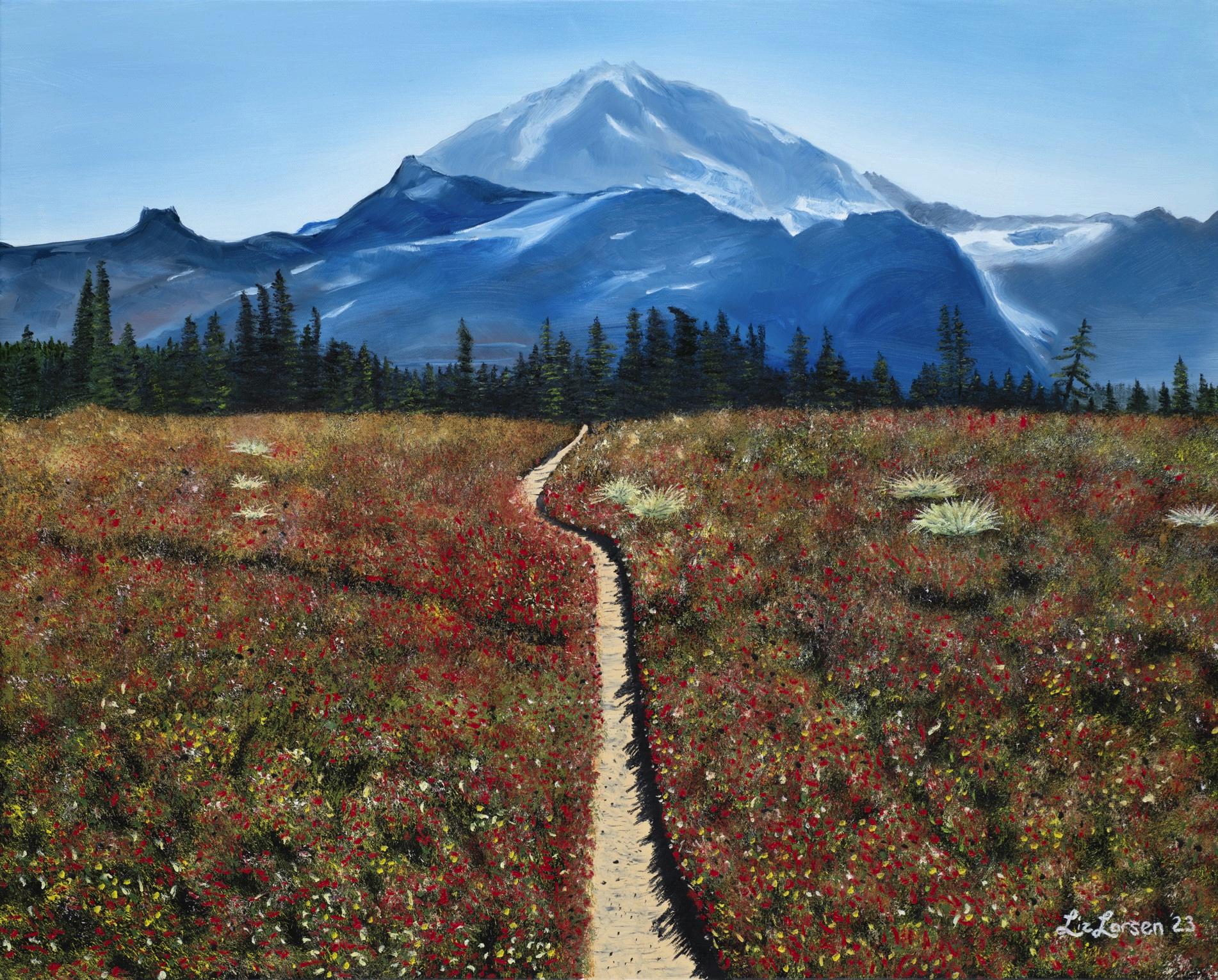 Painting, Oil Color on Canvas W:30 H:24 in 2023 LizLarsenisinspiredbythebeautyofnatureandoftenpaintspicturesfromherhikesaroundthePNW Thisview ofMt Rainiercapturesthemajesticbeautyofthemountain