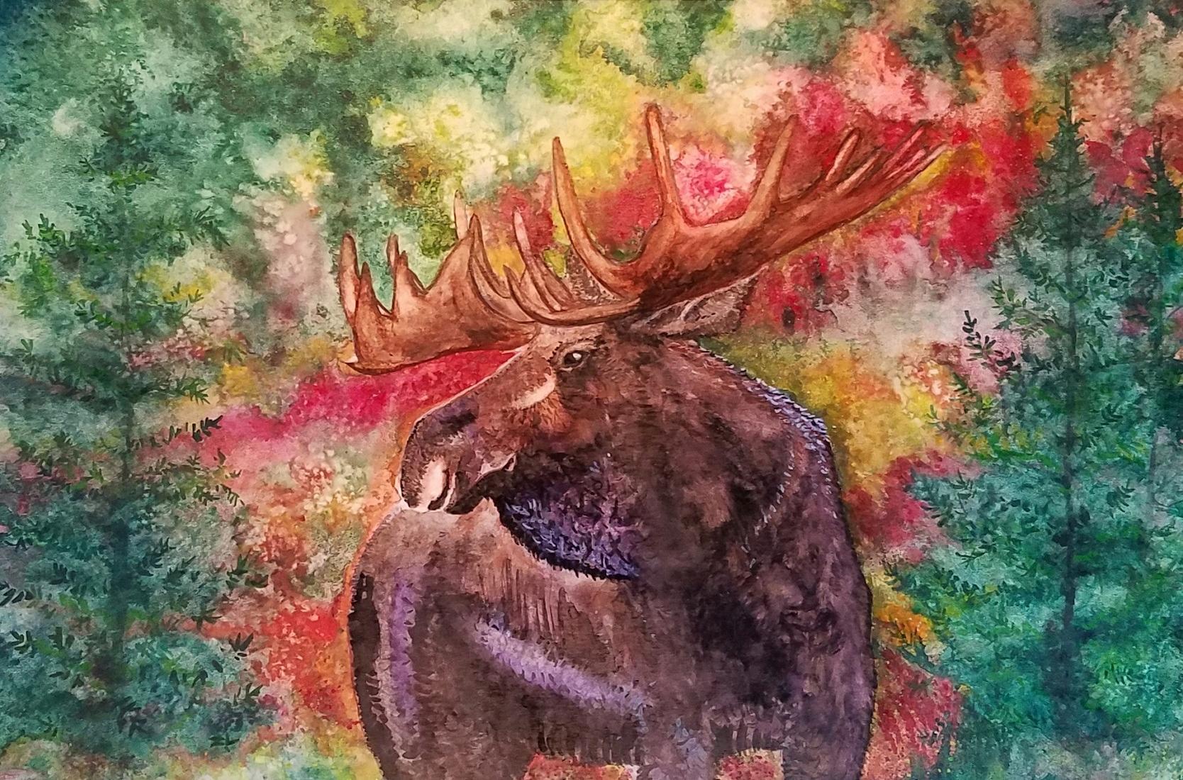 Thiswatercolourpaintingisanotherpieceforthe2019 "WildlifeExplosionofColour"seriesandisoneofthe Artist'sfavoritesalready ThetopicofMooseisacommonoccurrenceontheWesternsideofRockyMountain NationalParkrighthereinourownbackyards