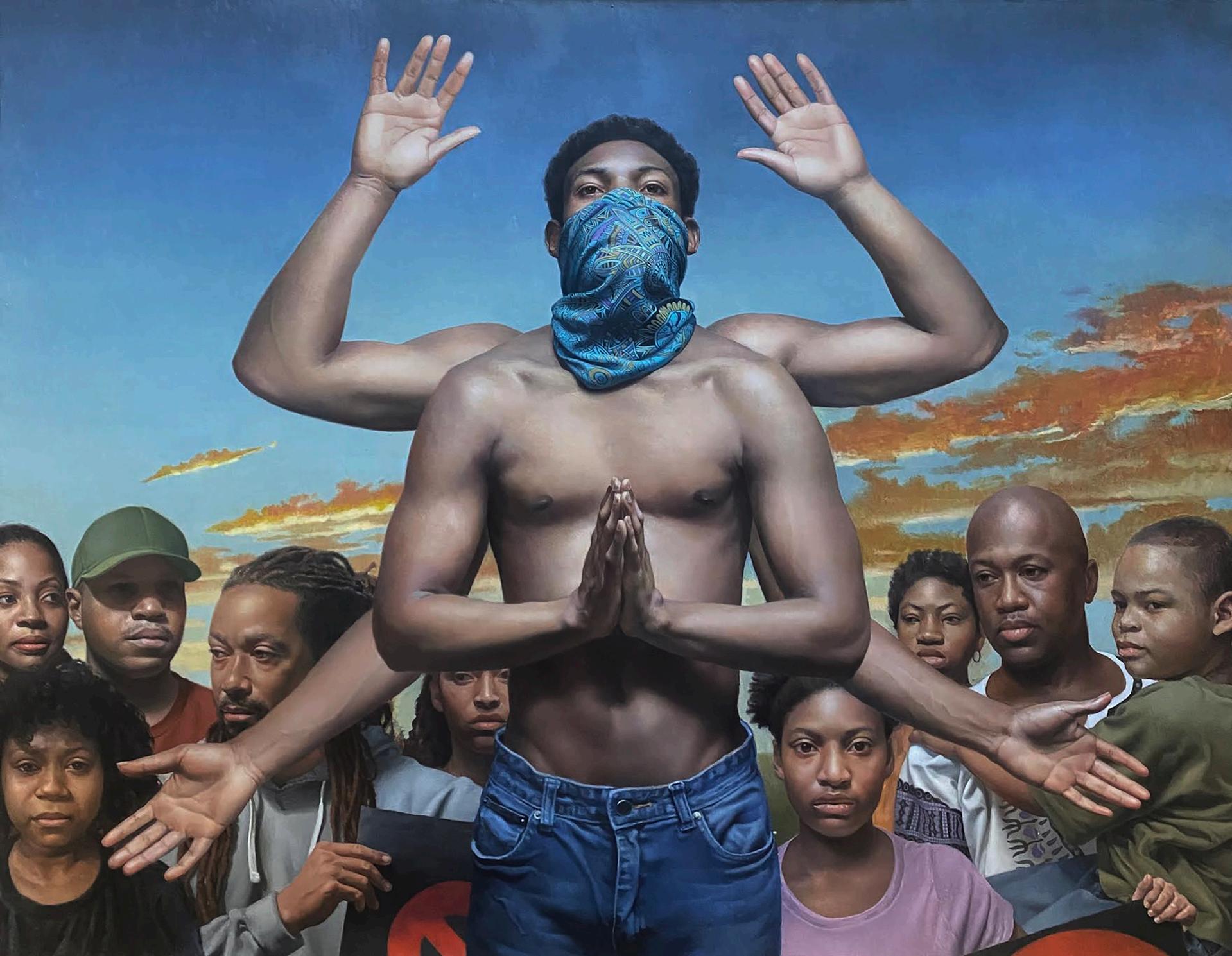 "Ubuntu", whichisaSouthAfricanwordmeaningtogetherness, illustratesthatonenessthatblackpeoplehave shownthroughouttheyearstomakechangeintheircommunities Thecenter gureisaguardianofthepeople whopraysandprotectsthosewho ghtforequity