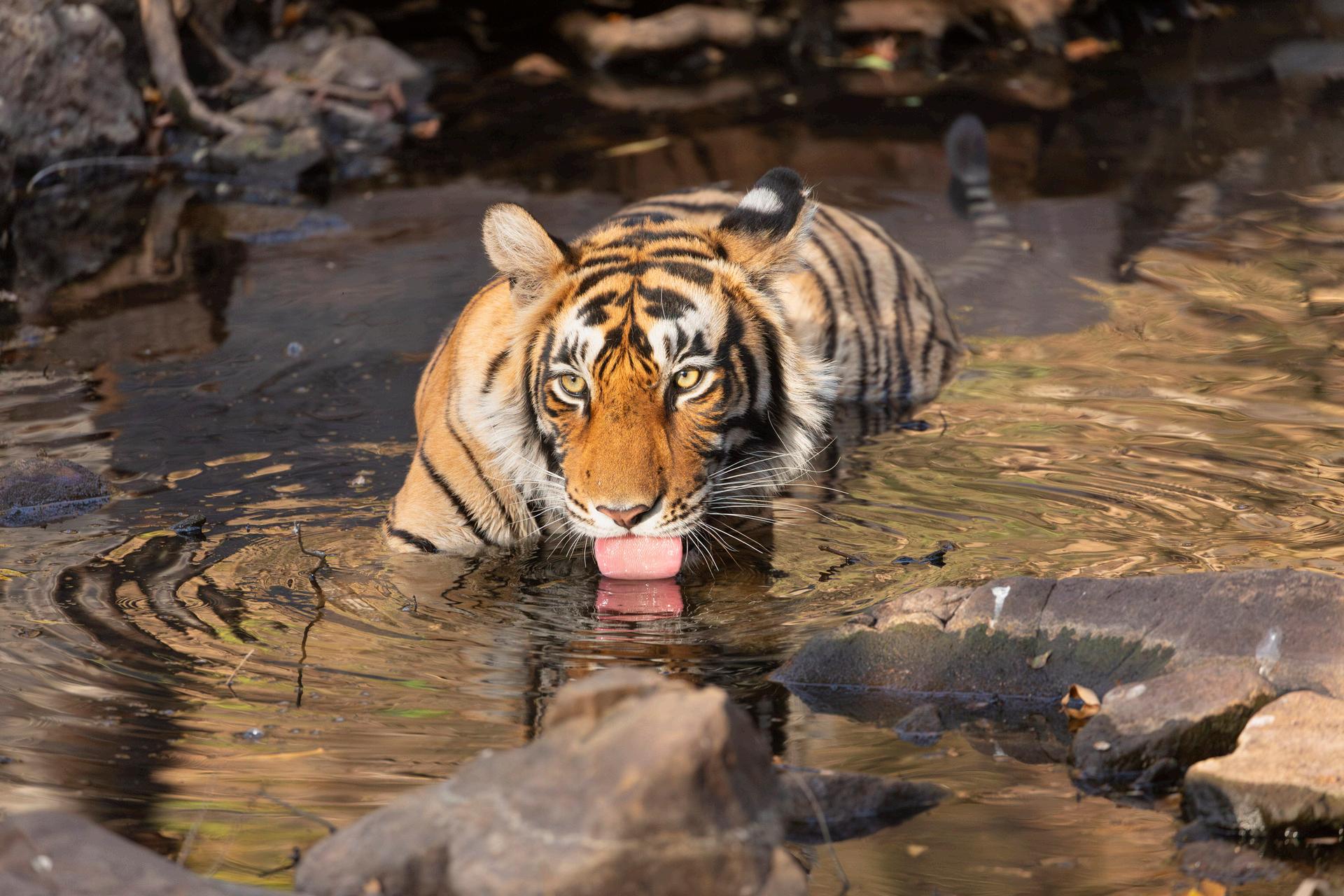AfterdaysofscorchingheatandunsuccessfultigersearchesinRanthamboreNationalPark, India, Ihada remarkableencounter Astunningfemalesub-adulttigeremergedforacooldrinkofwater Amidstgamevehicle chaos, sheposedelegantlyinfrontofme, knowingIwaseagerlywaitingforher