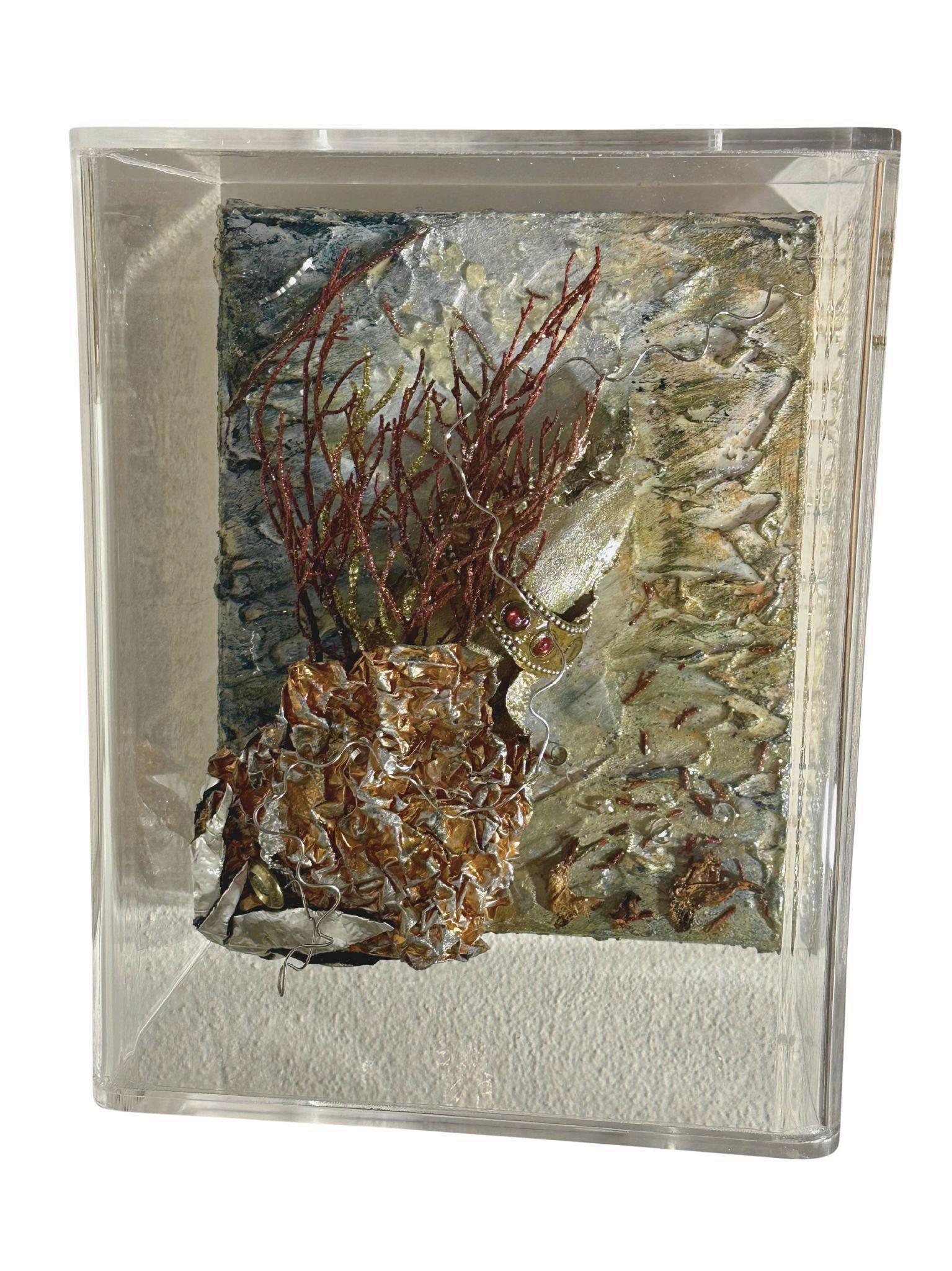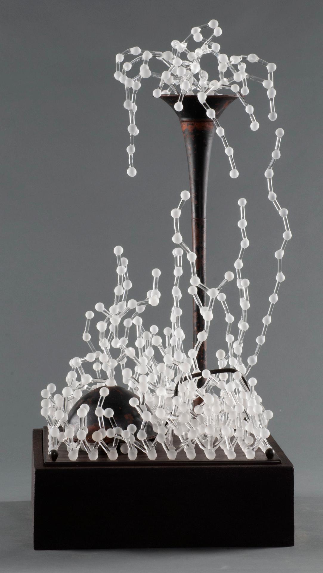 Flameworkedglass, foundobjects, perforatedsteel, painted