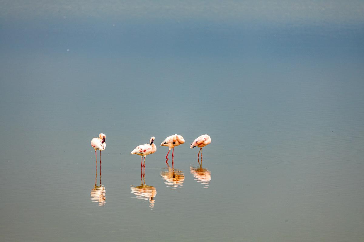 Astunningimageofflamingosstandinggracefullyinatranquillake, theirpinkfeathersmirroredperfectlyinthe stillwater Thesoftlightenhancesthesereneatmosphere, highlightingthebirds'elegantformsandthe symmetryoftheirreflections AW127889880