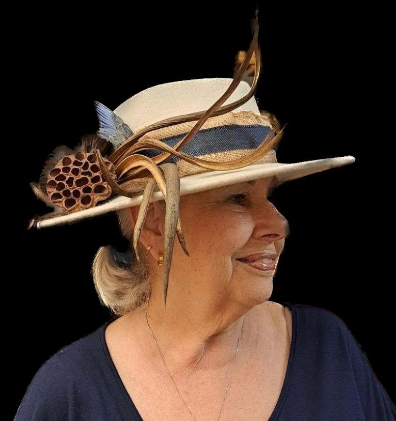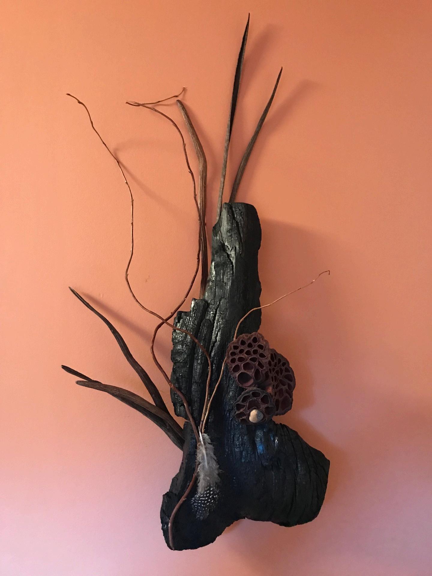 Apieceofburnt rewood, sealedwithpolyurethane, enhancedwithdriedcatalpapods, driedlotuspods, curly willowbranches, aguineahenfeatherandarock AW127024876