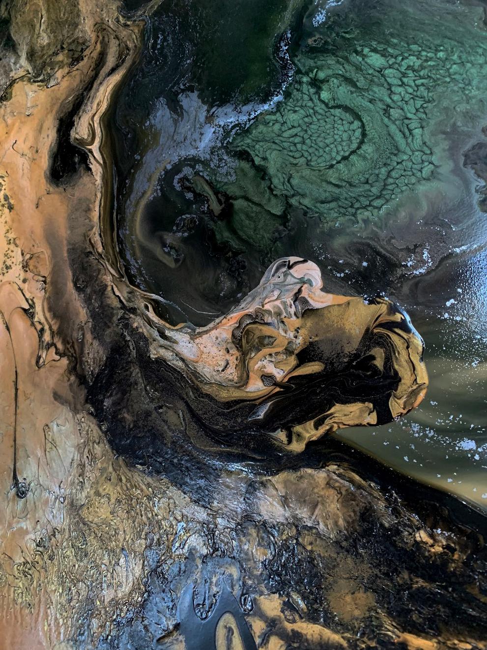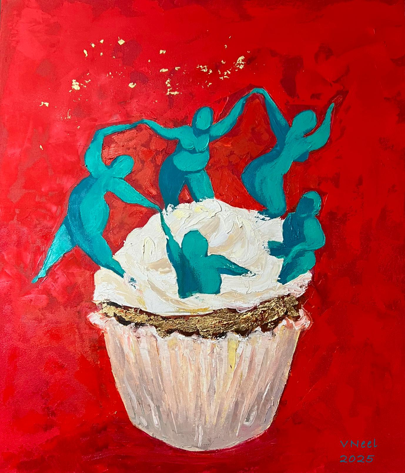 Thepainting "GoldRush"isacalltorethinkconsumptionhabits Turquoise gures, inspiredbyMatisse, dance atopacupcakewithgoldaccents, symbolizingindulgenceandexcess Theworkinvitesre ectiononsociety’s obsessionwithextravaganceandurgesashifttowardmindful, sustainabl