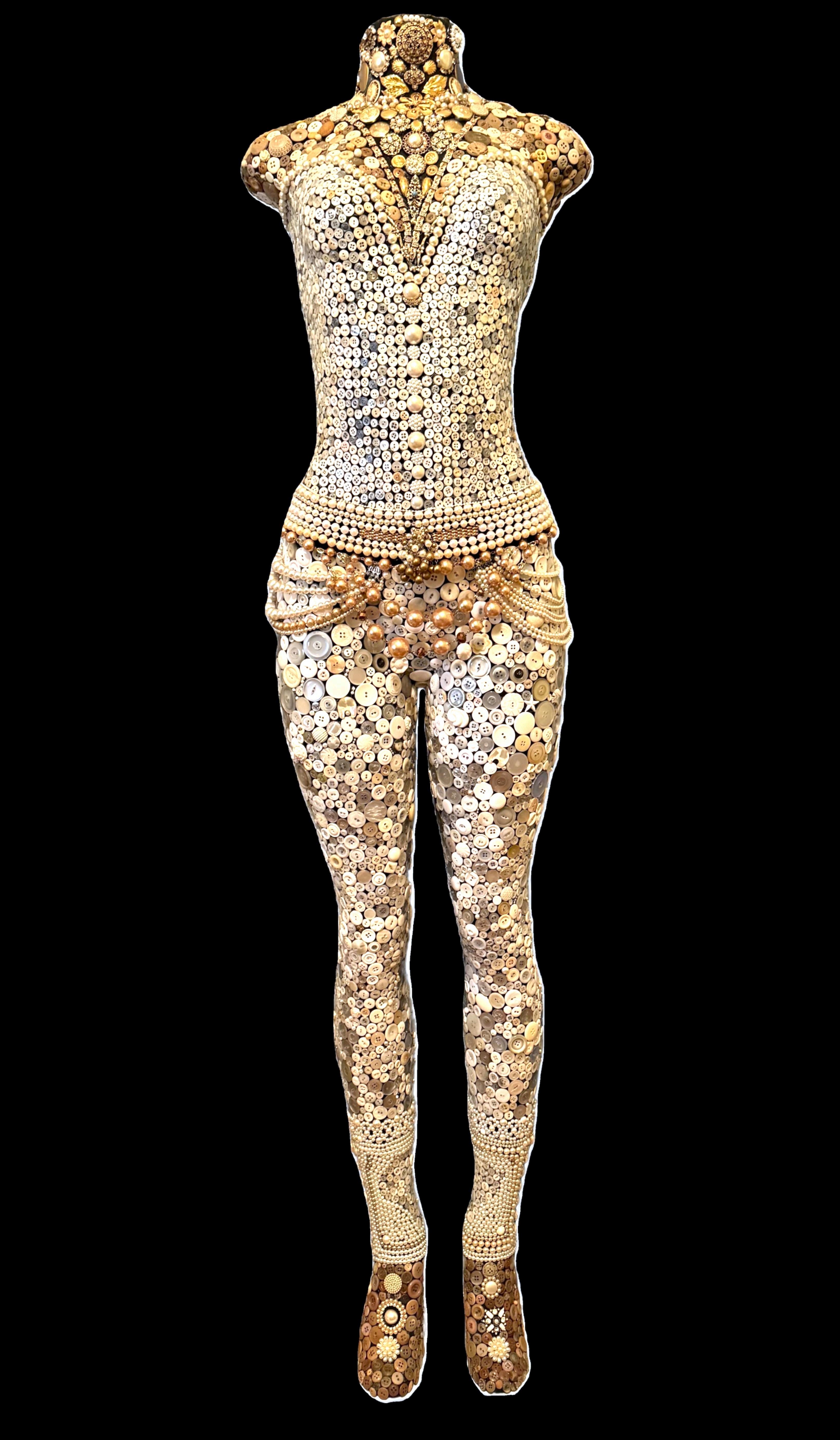ThismosaicwasinspiredbymyGreatGrandmotherMarieElodie Shewasbornin1895inOpelousas, Louisiana andshehadelevenchildren, and56grandchildren Thismosaicwasmadewithmostlymotherofpearlbuttons, culturedandfauxstringsofpearls, goldandgoldtonedjewelrypiecesandvintagewhitebuttons OldMom(as shewasknowntous)hadagreatheart Sheraisednotonlyherelevenchildren, butalsosixofher grandchildren Shewasstrong, resilient, andloyalalwayscookingupwonderfulmealsforthosethatshe lovedThisfullsizemannequinwascreatedusingamosaicofpearlsandvintagebuttonsincludingmotherof pearl(abaloneshellbuttons)andgoldtonedbuttonsandgoldandgoldtonedjewelry
