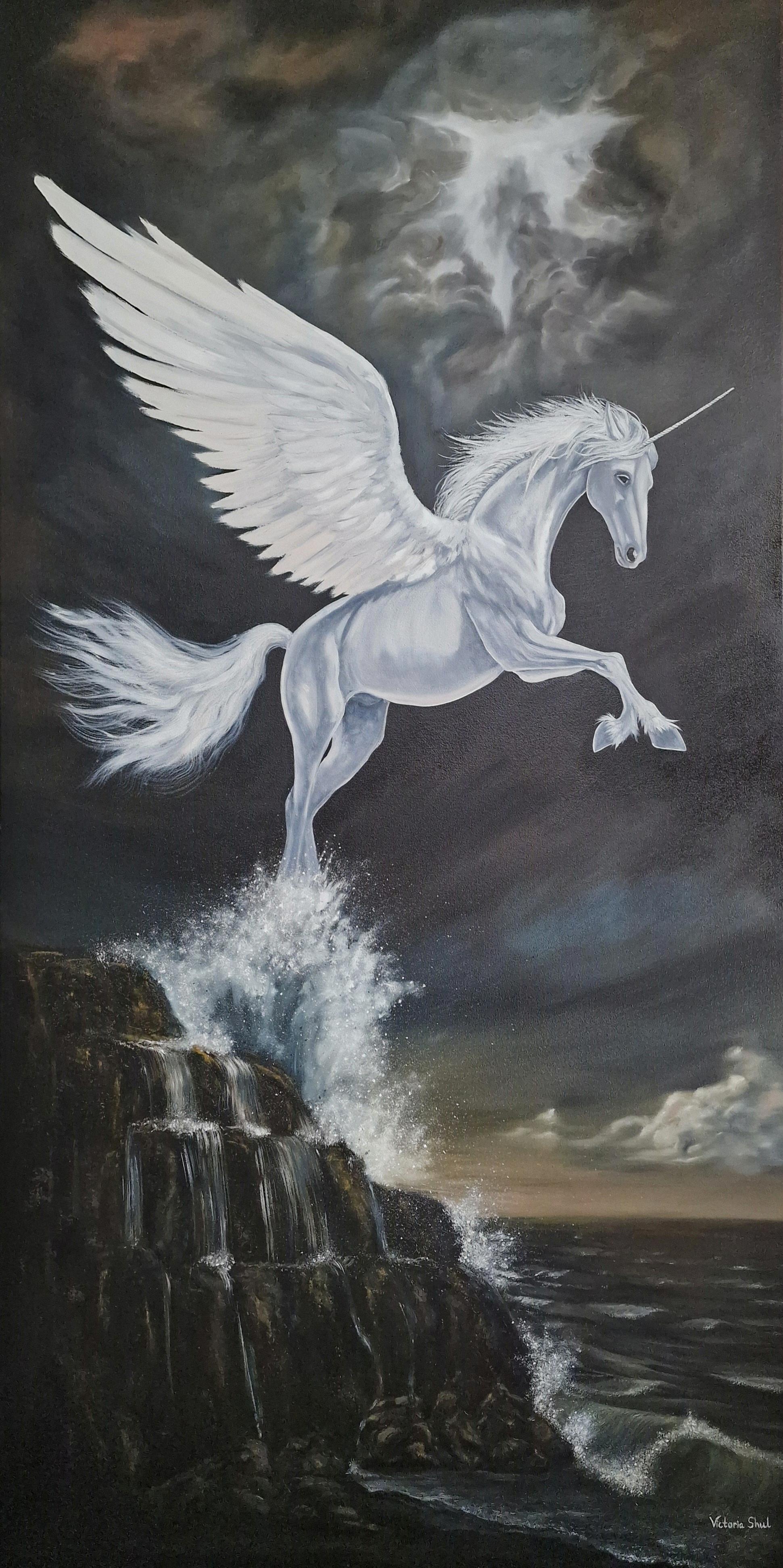 ThismysticaloilpaintingoncanvascapturestheetherealbeautyofawingedAlicornsoaringmajesticallyover cascadingwaterfallsunderadramaticandotherworldlynightsky TheAlicorn, depictedinradiantwhitetones, symbolizespurity, power, andthetranscendenceofearthlylimitations
