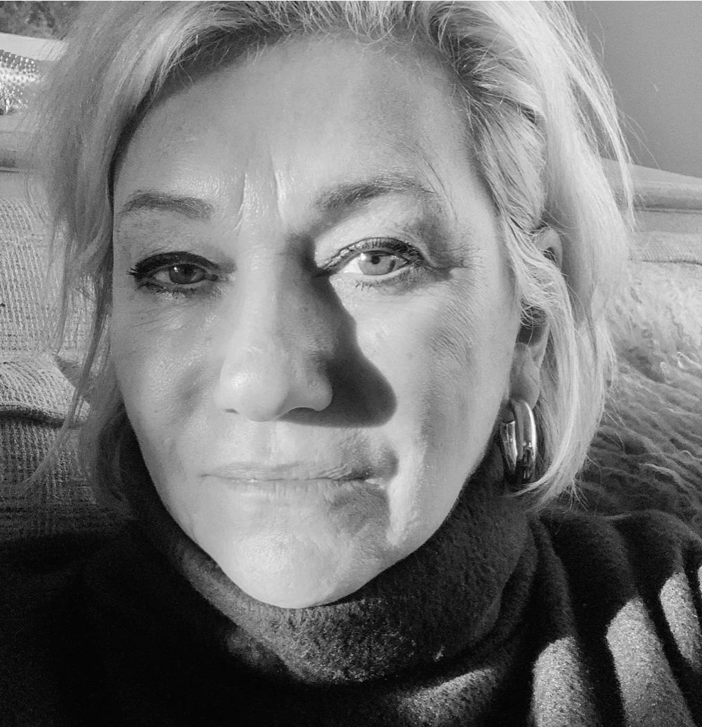 Ablackandwhiteportraitwithaangelwingearringinfrontofalivelybackground