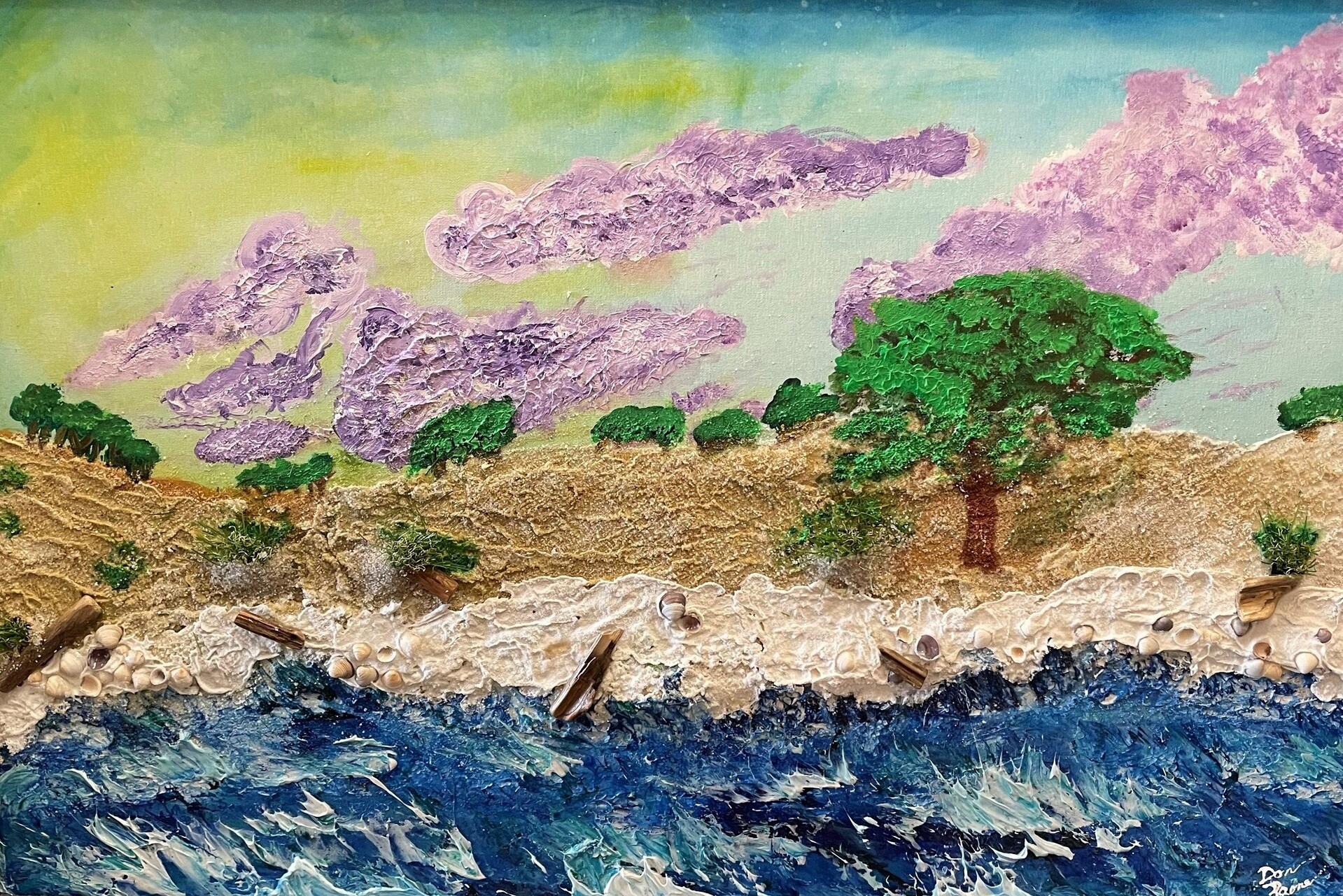 Thispieceisacollagewithrealsand, a xedseagull, anddriftwoodinapaintedbackground