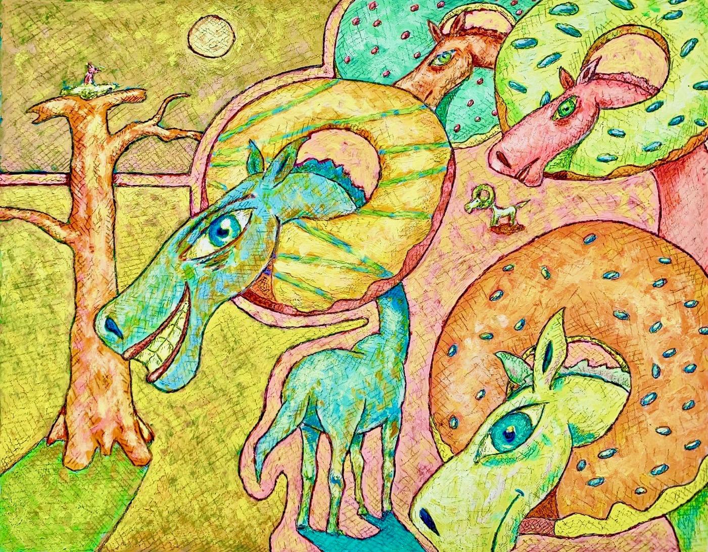 Painting, Gouache W:14 H:11 in 2024 Strangehorseswiththeirheadsgoingthroughdoughnuts