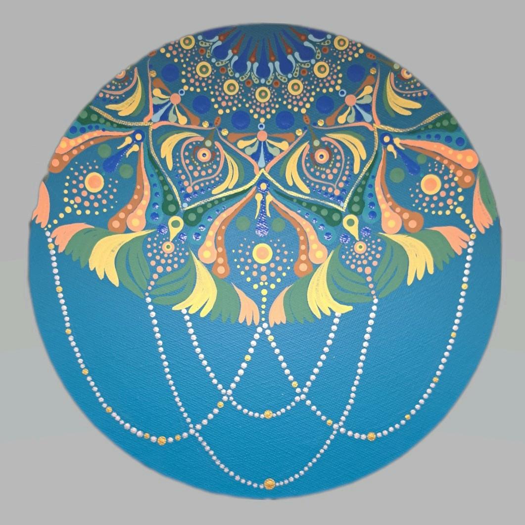 "Forever"isamesmerizing22"originalroundsilkpaintingshowcasinglusciouscoral, eryorangerosesset againstadeepturquoisebluebackground Theroundshaperepresentseternityandtheroseembodiesthe delicatebeautyandpassionofloveinthiscaptivating oralmasterpiece