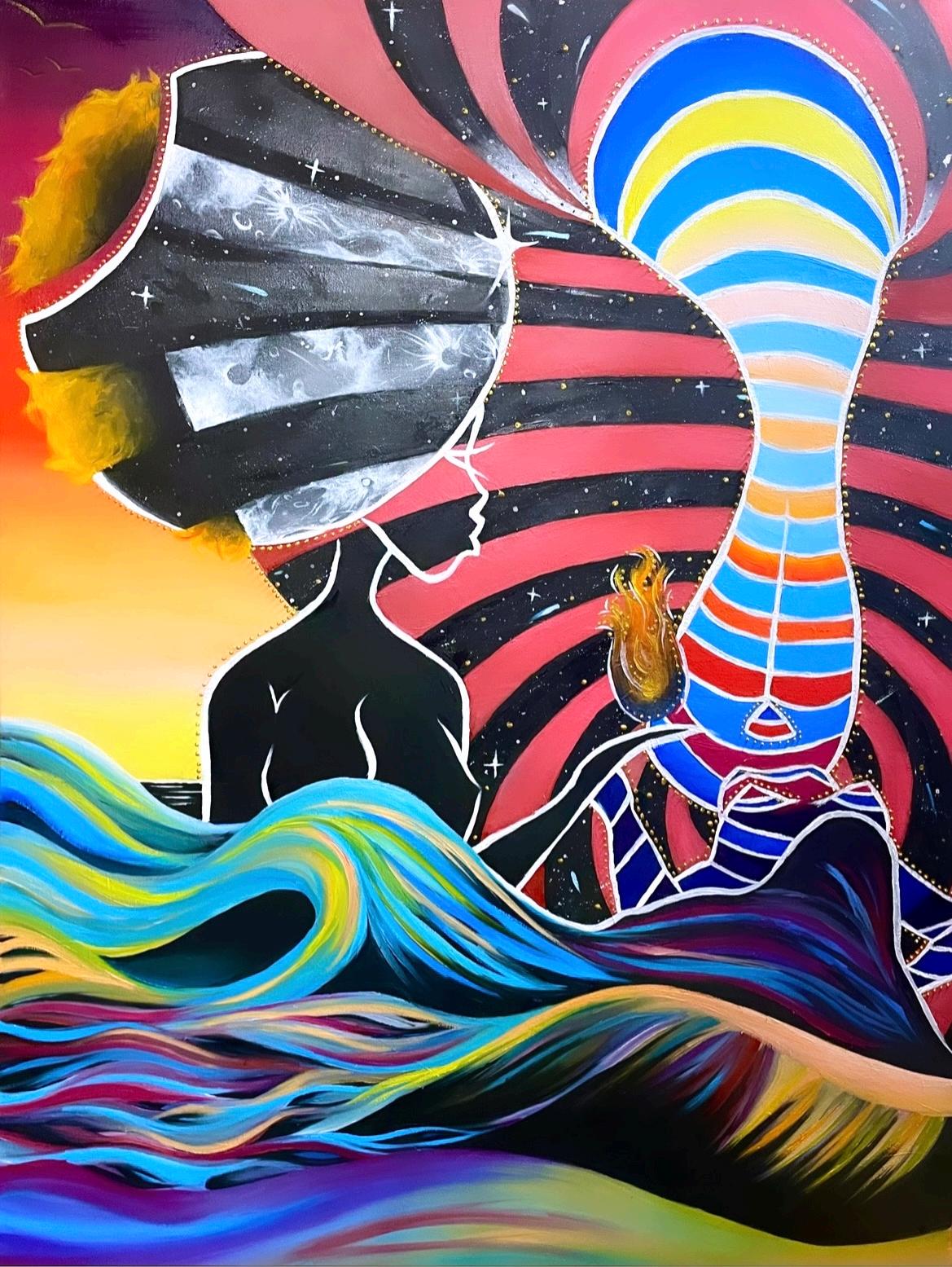 NextNewMoonsymbolizesbalancethroughcolor, form, symbolism Itembodiesnewbeginnings& transformationwithitsAfro-centricpalette&organiclines Theartworkinvitesintrospectiononself-care& holistichealing, urgingviewersto ndequilibriumwithinthemselves&theirenvironment