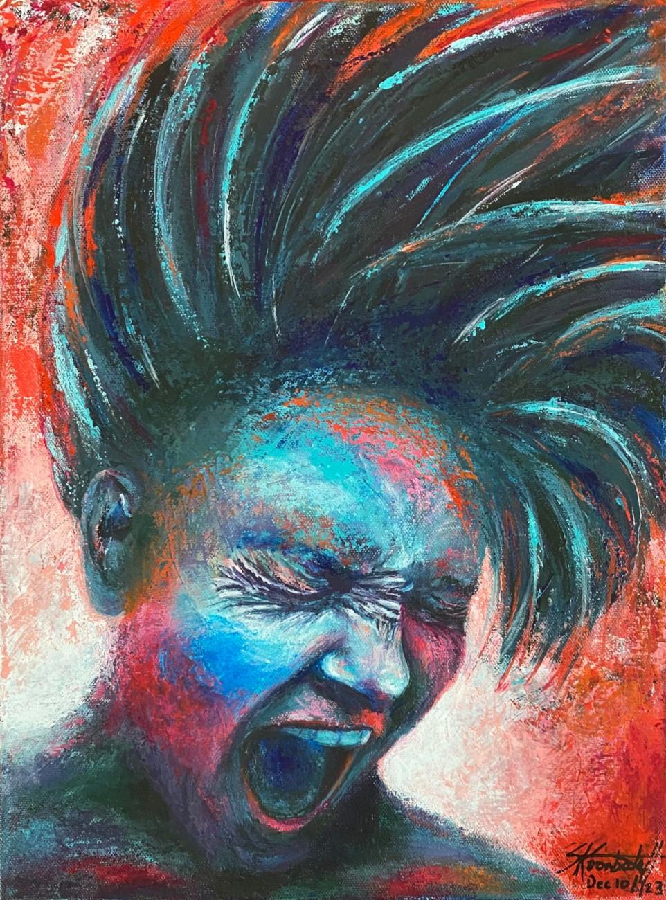 Thisartworkisdeeplypersonal, utilizingself-portraiturealongsideabstract, mixedmediamethodology Incorporatingusedpaintscraps, recycledAmazonpackaging, asawblade, acandle, andhandpaintedimagery offersaglimpseintomyownintimateemotions