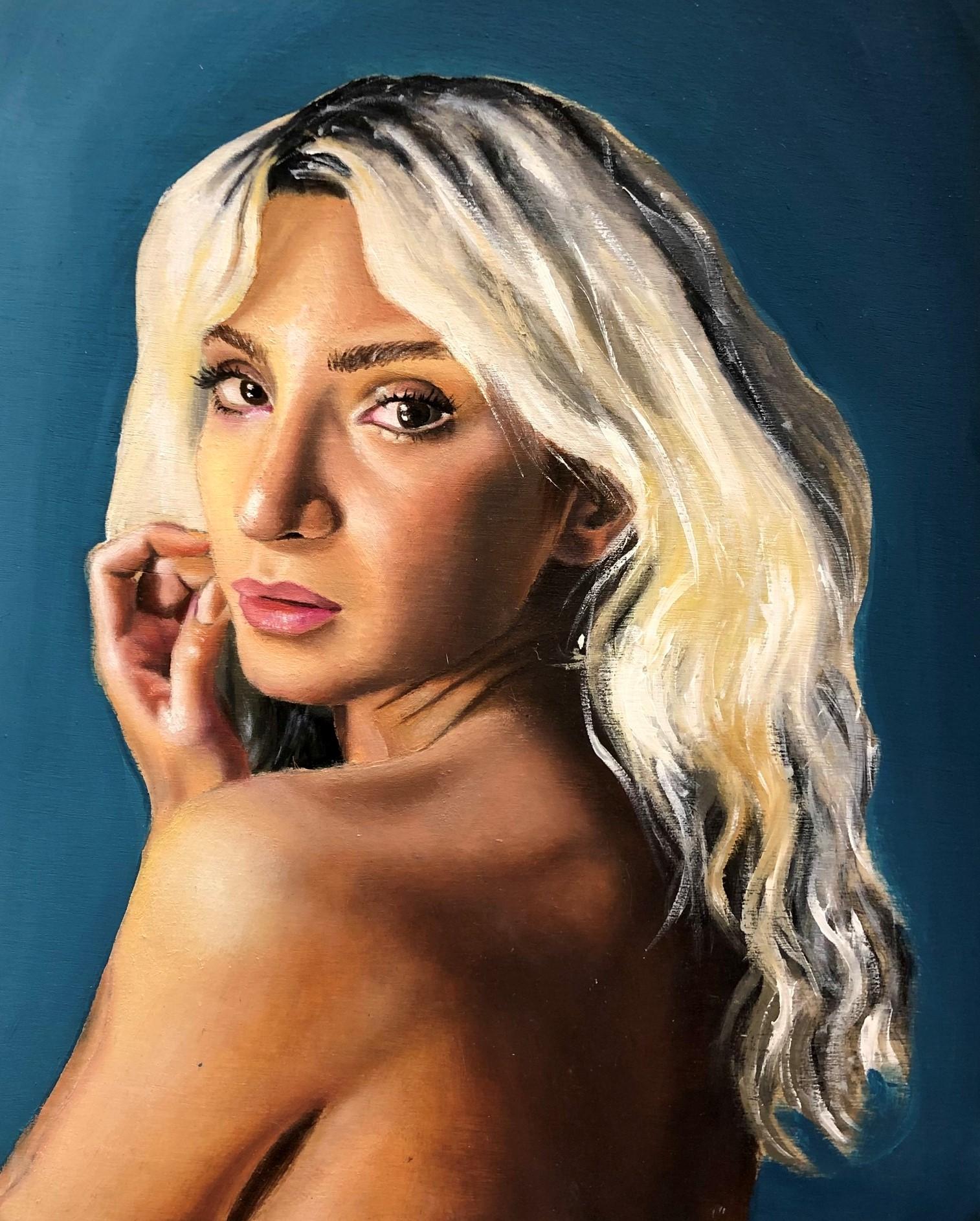 Artistonish artistonish com/november2022 8 Caity in Gold Celena Amburgey Painting, Gold Leaf, Oil Color on Canvas W:20 H:16 in 2020 IplacedCaityinapositionthatsheislookingbacktowardsme Shewasstandingatawindowandwasbacklit I Igoldleafedthebackgroundtoaddaniconicreverence Ithinkthereisbeautyandstrengthintheactof lookingbackthatmirrorsthestrengthofCaity'scharacter AW127455568 ♡