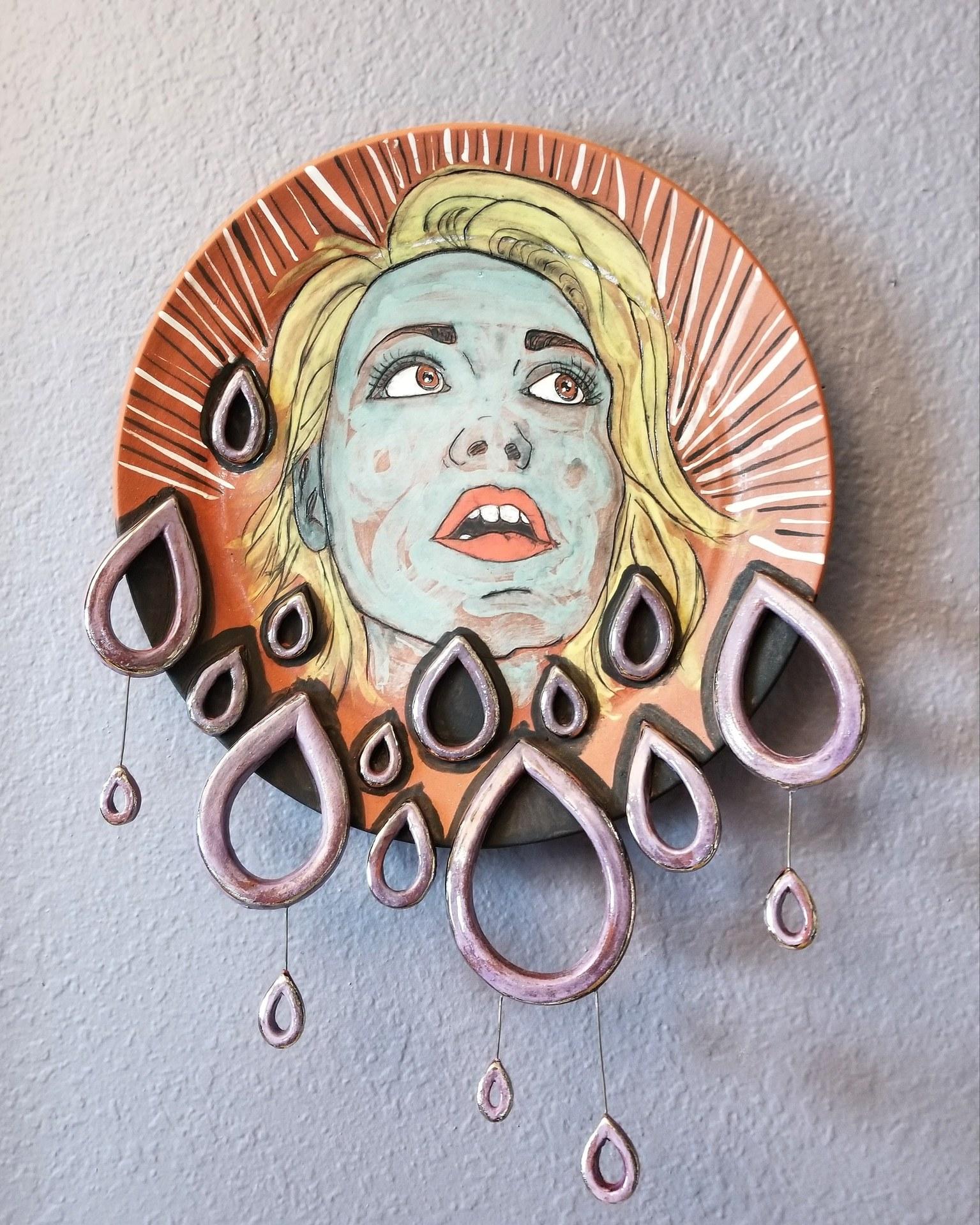 Artistonish artistonish com/november2022 20 Self Portrait: Tribute to Cindy Sherman and Prince Heather Cornelius Sculpture on Ceramic W:8 H:16 in 2017 Terracotta redwithnichromewire, underglaze, swarovskicrystal, goldluster AW127380984 ♡