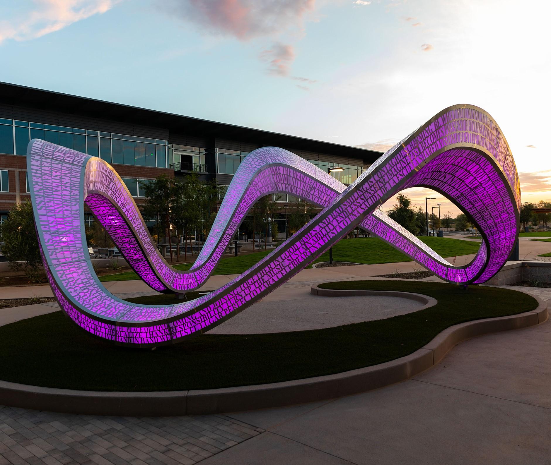 Artistonish artistonish com/november2022 22 Great Joy Blessing Hancock Sculpture W:300 H:216 in 2022 StainlessSteel, polycarbonateandLEDlighting Theartworkre ectsthespiritofGoodyearCivicCenterasa destinationforcommunitycelebrationandconnectivity TheCityrequestedastatementpiecethatvisitorscould passthroughwhilealsoprovidingacontrasttotheformalgeometryoftheciviccenterarchitecture Itis composedofwords AW127099544 ♡