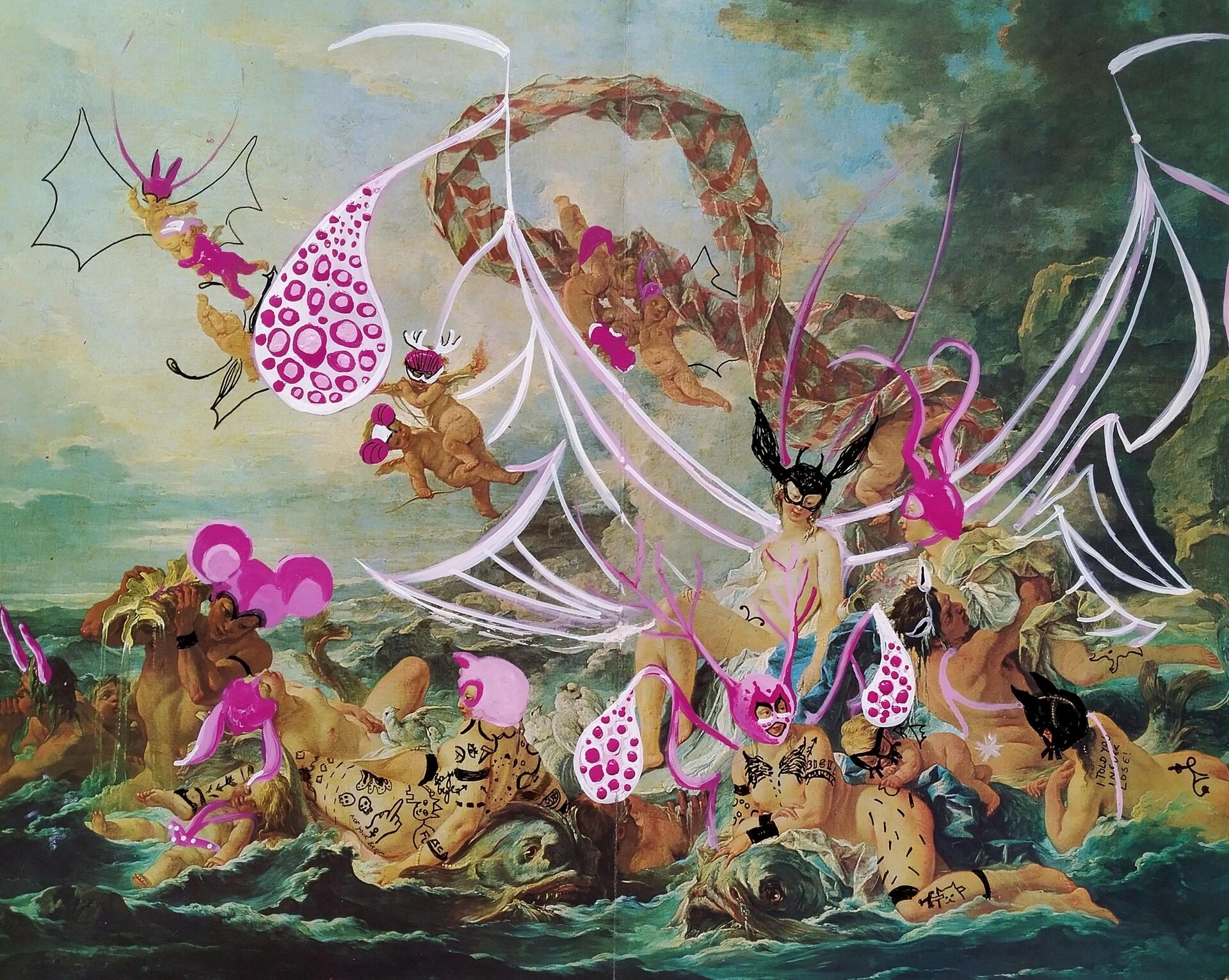 Illustration, Beadwork, Embroidery, Photographic Collage on Canvas W:16 H:20 in