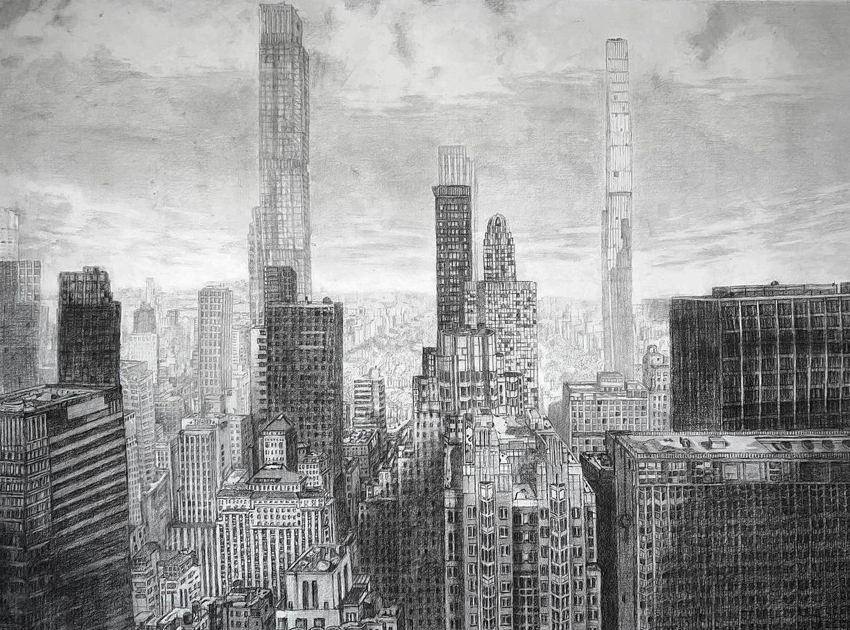 “AviewfromtheBNPPARIBASbuilding”2022265”x36”carbon,graphiteandcharcoalonpaper (ScanQRcodetolearnmore, rateandcomment)