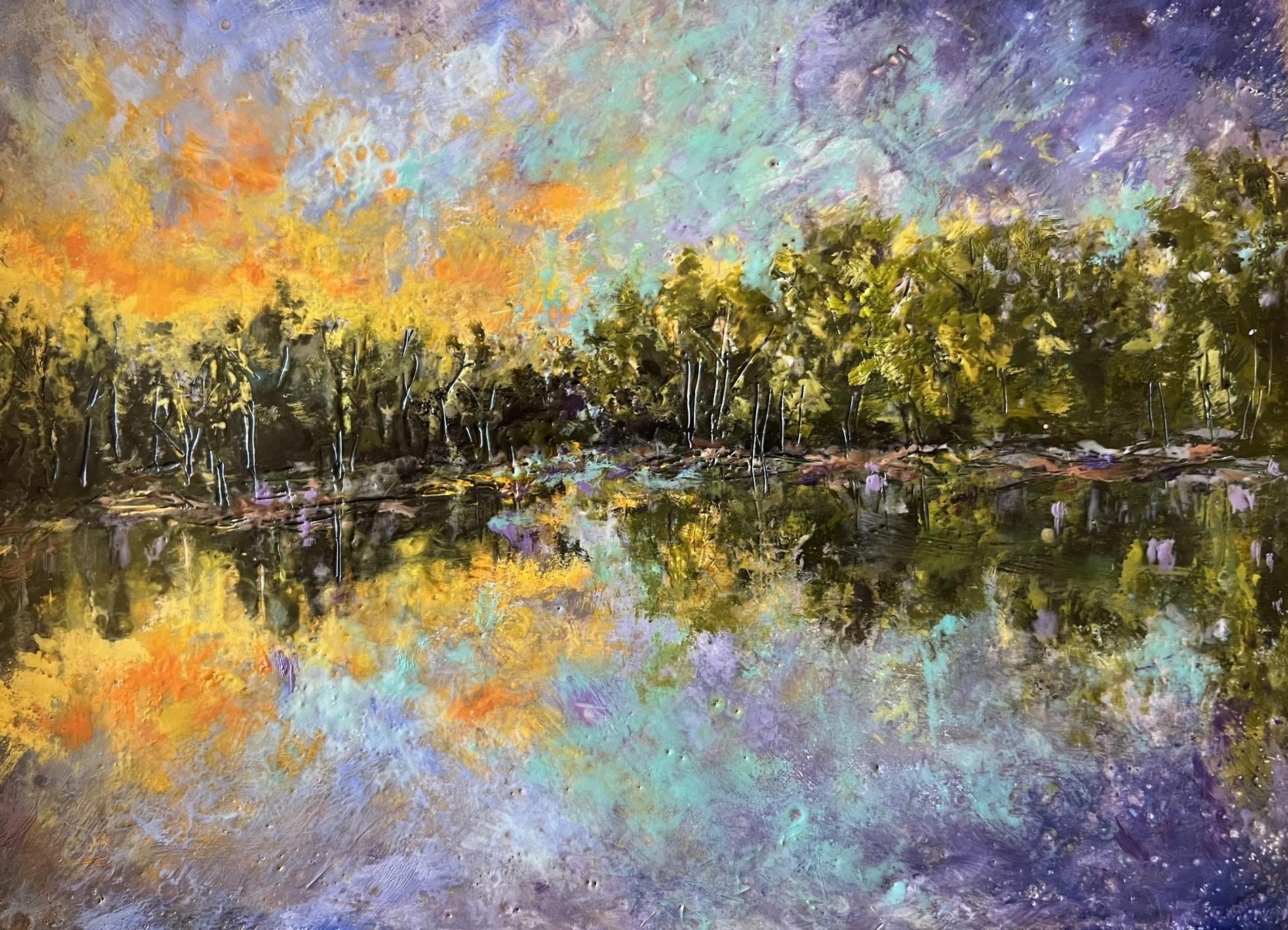 AbeautifulpaintingofthesunriseovertheBitterrootriverinMontana Vibrantskycolorsre ectinthewater astheriverwakesuptoasummermorningalongthetreelinedbanks (ScanQRcodetolearnmore rateandcomment)