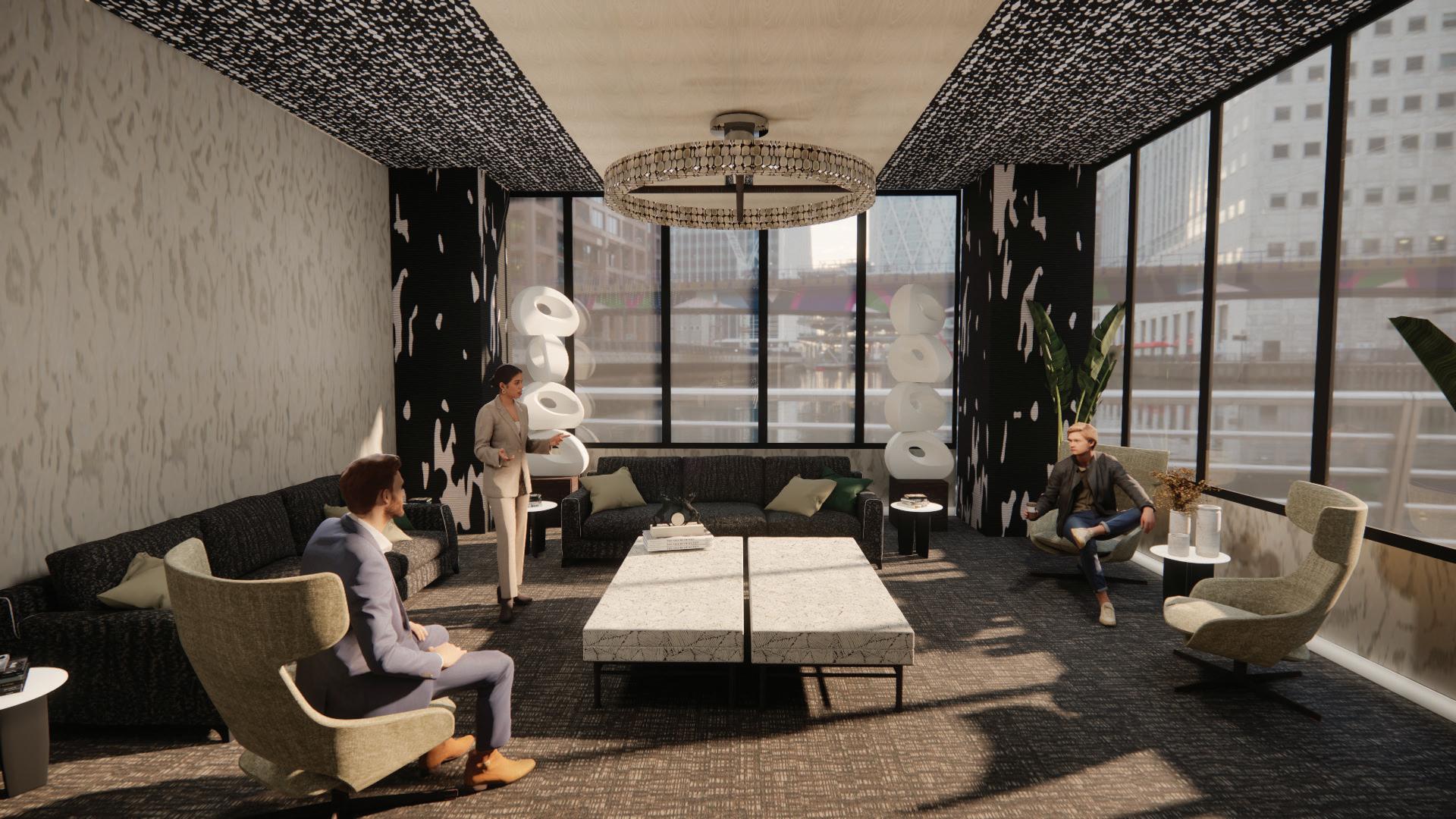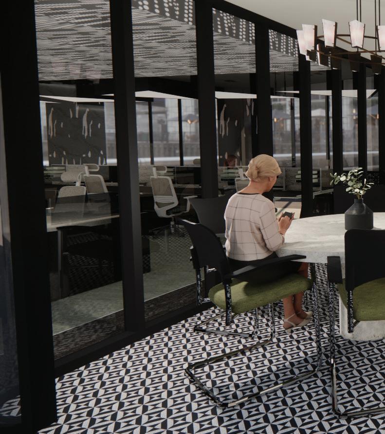 The breakroom is designed as a modern retreat, a quiet space to recharge or connect away from the busy office.