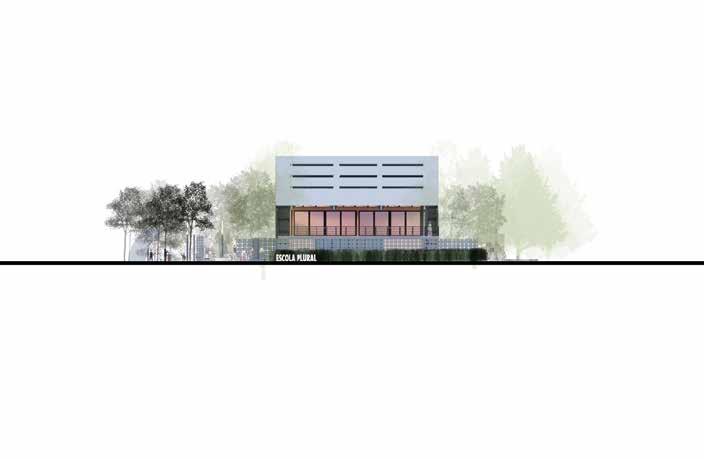 OBJETIVO: O projeto é uma escola de 2º ciclo de ensino fundamental que visa auxiliar a escola municipal adjacente a partir do compartilhamento de espaços, como a quadra poliesportiva e o pátio externo, em um sistema de parceria. Além disso, com o intuito de educar a comunidade externa, a Escola Plural possui um funcionamento híbrido, sendo aberta ao público nos finais de semana, o que transforma o pátio externo em um parque de entrada livre. Ademais, para o maior incentivo à população pela procura de cursos profissionalizantes, o auditório, a sala de leitura e a sala multiuso também são utilizados como espaços de aprendizagem coletiva, oferecendo aulas de matemática financeira, português básico e informática; além de oficinas e rodas de debates sobre temáticas como sustentabilidade, igualdade de gênero, práticas de combate ao racismo, etc.