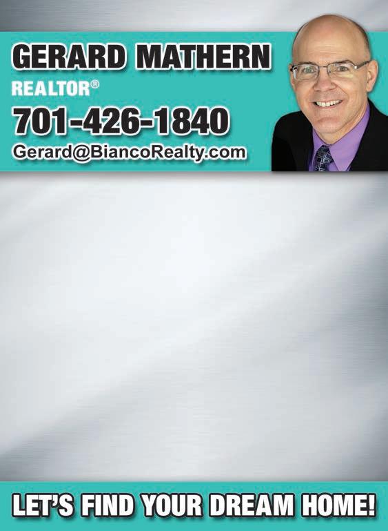 Country Living • Rural NW Bismarck Paved Roads • Walking Trails #3413386 $75,000 “THE RANCH” LOT Low Specials • SouthBay • Open Concept 3 Bedrooms • 3 Baths • Quartz Countertops #4000946 $344,900 NEW TWINHOME Spacious, 5 BR, 4 BA, Open Concept Curb Appeal, 3,904 Sq. Ft. #4003713 $609,000 PROMONTORY POINT RANCH Walkout Basement • Open Concept Main Floor Laundry • Spacious #4002405 $335,000 RANCH STYLE TWINHOME 1 Acre, Mature Trees, Privacy Character, A Must See #4004002 $799,500 ONE-OF-A-KIND Iconic Super Slide Amusement Park Once In A Lifetime Chance To Own #3411724 $795,000 AMUSEMENT PARK FOR SALE New Construction • 3 BR • 3 BA Maintenance Free • Quartz Countertops #4000999 $349,900 SOUTHBAY TWINHOME SOLD Upgrades • Open Floor Plan Walkout Basement • Fenced Yard #4002548 $563,000 RANCH STYLE SOLD Fenced Yard • Recently Painted 2,016 Sq. Ft. • 4 Beds • 2 Baths #4002470 $235,000 PARK-LIKE YARD SOLD