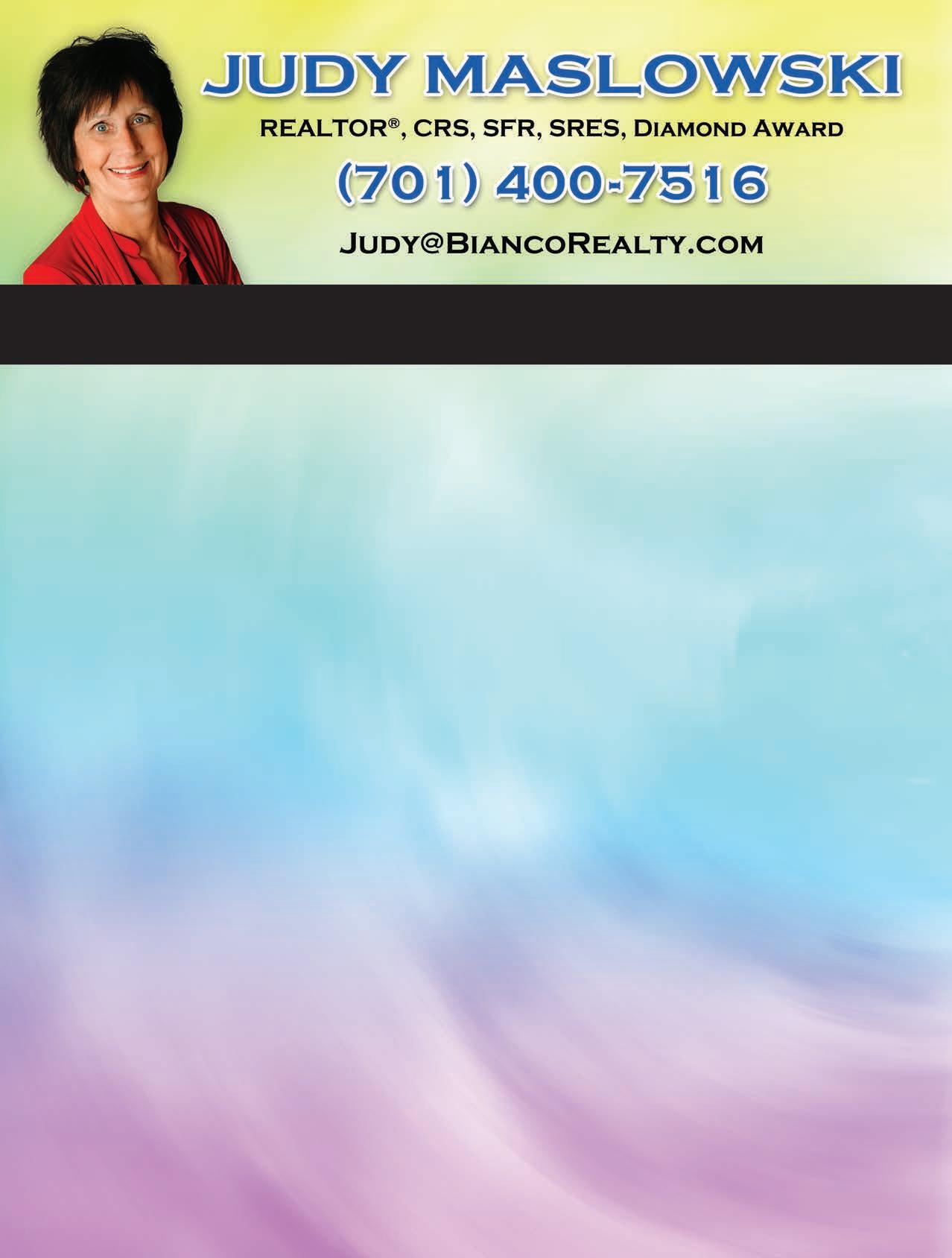Amy Asche “Platinum REALTOR® Award Recipient” Your Full-Time REALTOR®, CRS (701) 426-0107 Amy@BiancoRealty.com www.WelcomeHomeND.com OFF 43RD AVENUE NE | BISMARCK #4012406 Rare opportunity to own 90+ acres only minutes NE of Bismarck. Located right off 43rd Avenue and just west of 80th Street. 4017 NEW ROCKFORD PLACE | BISMARCK #4012444 5 bed/4 bath spacious home, 4,060 sq. ft., walkout basement, huge 1,581 sq. ft. garage, cul-de-sac, professional landscaping, built 2014, stucco & steel siding, no direct backyard neighbors. 1120 N 12TH STREET #15 | BISMARCK #4010366 3 bed/2 bath condo, secure building, 55+ age requirement, carefree living, new patio door, 2nd floor with elevator, heated common garage, 1,225 sq. ft., open floorplan, community room. 2123 ARABIAN DRIVE | MANDAN #4011665 4 bed/4 bath move-in ready country home just minutes north of Mandan, mature trees, beautiful landscaping, saltwater pool, 40x60 heated shop, 1,101 sq. ft. attached garage & main floor laundry. PRICE: $1,364,545 PRICE: $789,900 PRICE: $159,900 PRICE: $689,900