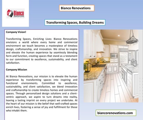 At Bianco Renovations, our mission is to elevate the human experience by transforming spaces into inspiring and functional environments. Committed to excellence, sustainability, and client satisfaction, we blend innovation and craftsmanship to create timeless homes and commercial spaces. Through personalized design solutions and a clientcentric approach, we aspire to turn dreams into reality, leaving a lasting imprint on every project we undertake. At the heart of our mission is the belief that well-crafted spaces enrich lives, fostering a sense of joy and fulfillment for those who inhabit them.
