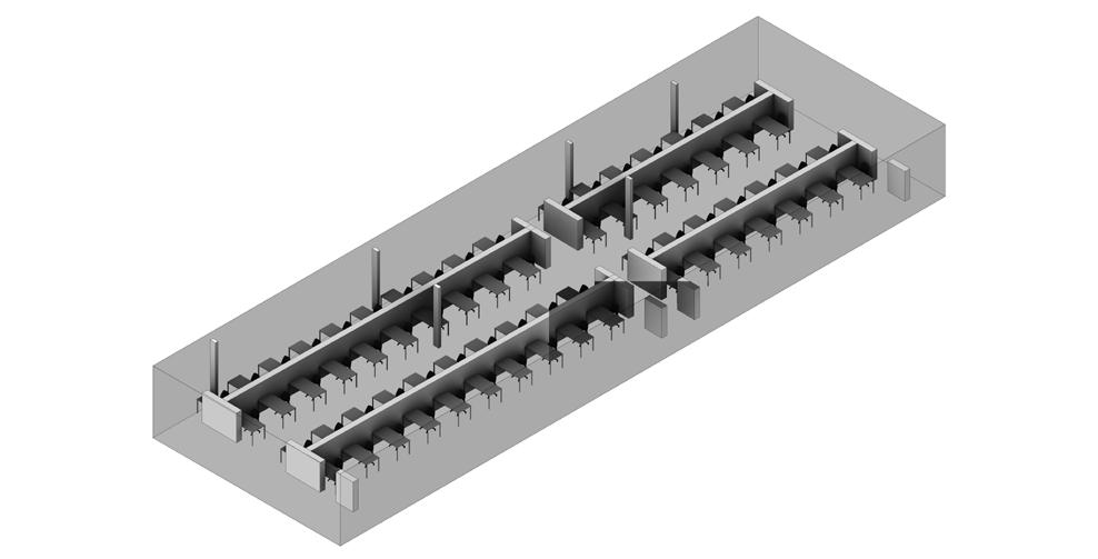 The first floor of the big cube is designed as the new Kerk Hall. This new audi torium will be much larger than the old Kerk Hall and can accommodate larger academic events held by the school in the future. The first-floor program of the small cube has many study rooms, small meeting rooms, and recreation rooms.