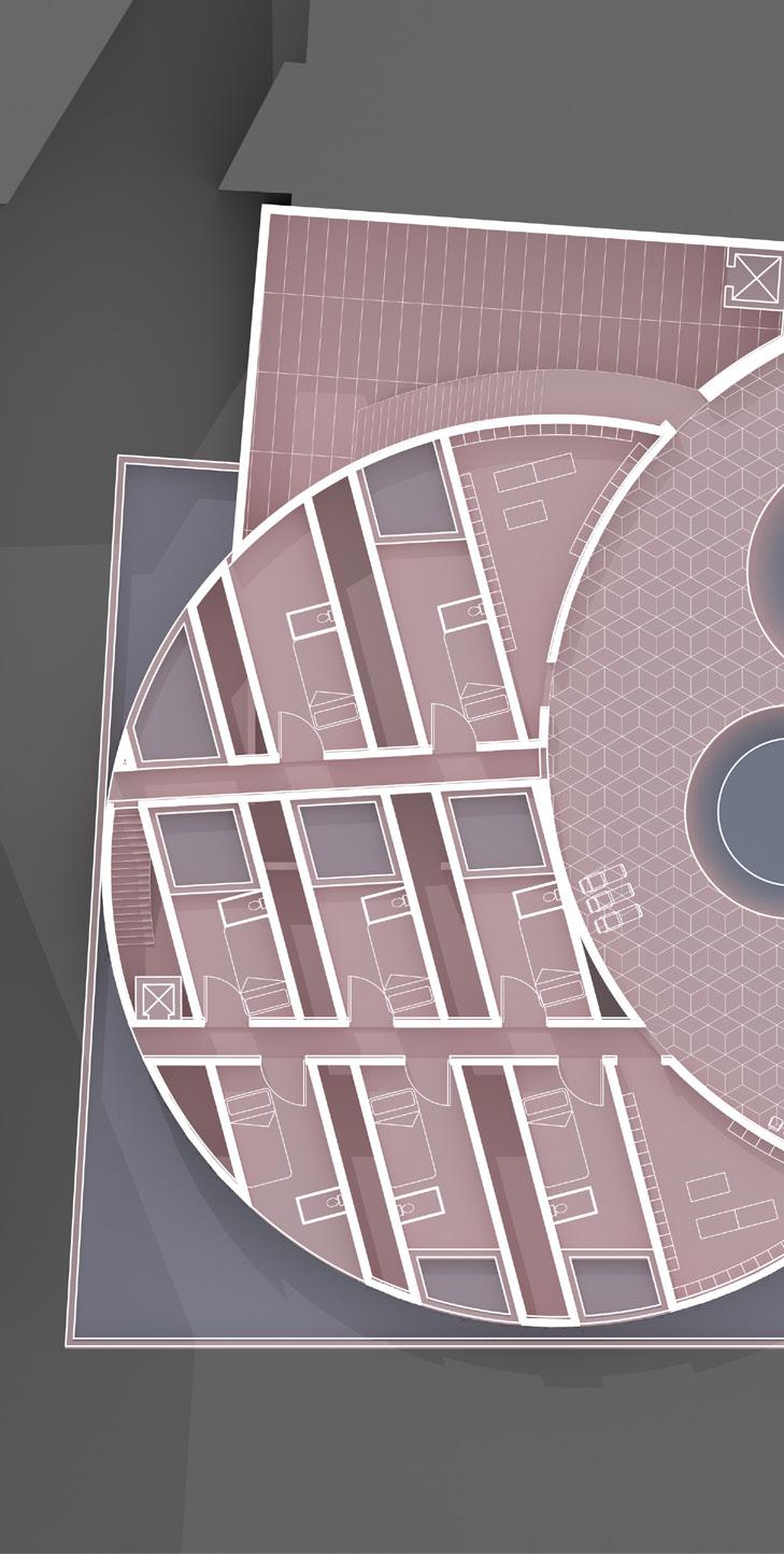 FLOORThe circle on the left of the second floor is designed as Two long corridors connect the hotel rooms area and the locker rooms between the two areas, so that the two locker