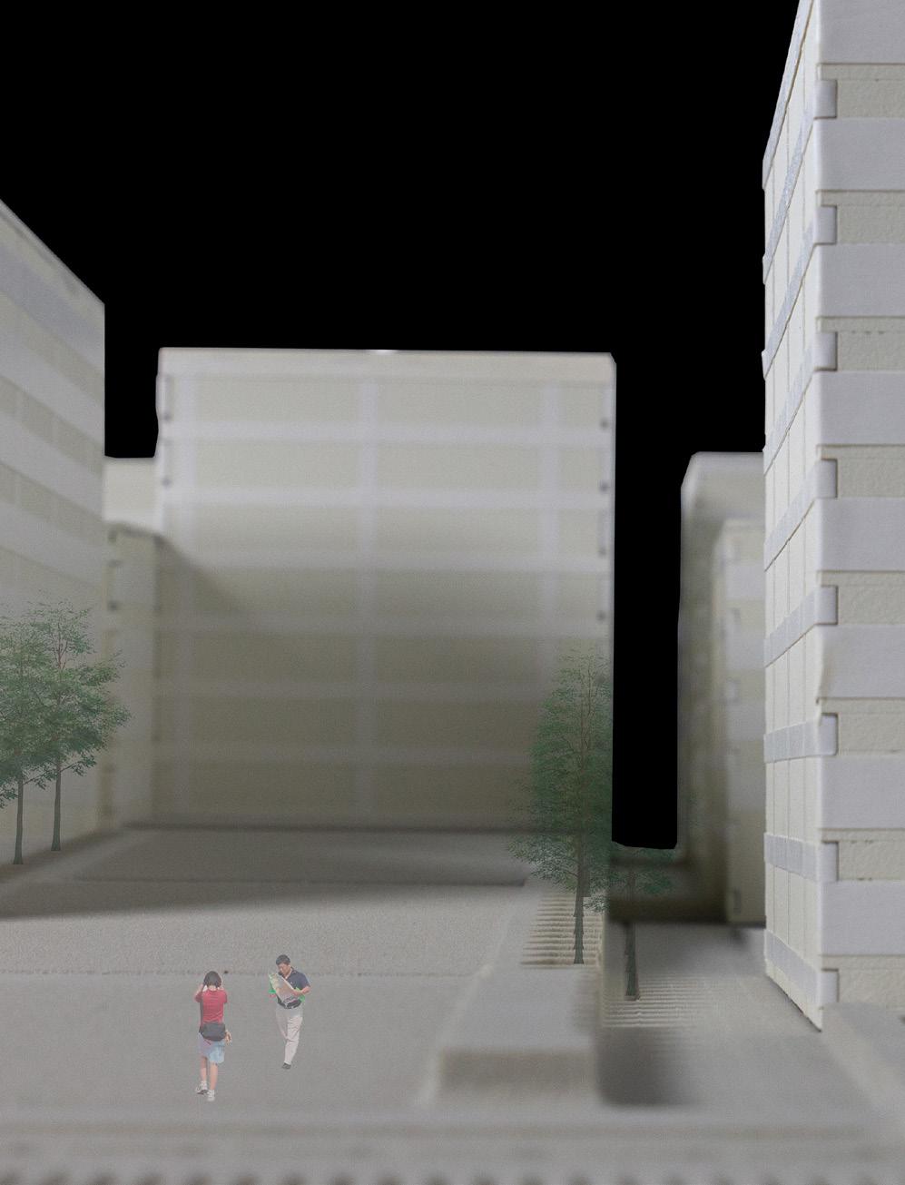 Circulation is a very important part of this project. It is divided into two parts: the indoor is a systematic circulation composed of many small-scaled stairs, eleva tors, and escalators, connecting different programs in the indoor; the outdoor is composed of large-scaled bridges and ramps, connecting different buildings, and putting public spaces such as libraries and cafes here to provide people