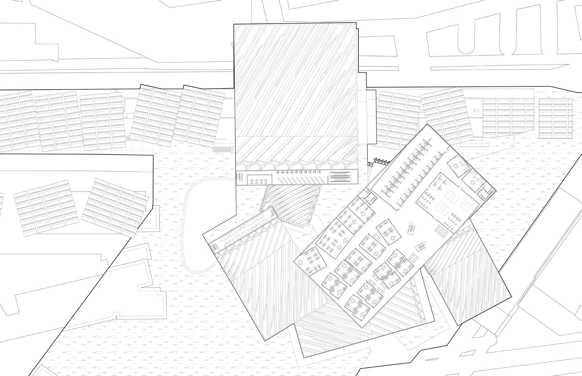 The new scheme is designed on the roof and parking lot of the existing SCIArc building. The new scheme design consists of two cubes of different scales and five slabs of different scales. Four of the slabs are folded to form a mass ing with large flats and vertical spaces. The two cubes not only have many public space programs but also have structural functions that support the new design of the entire project. Each building is connected through circu lation, and programs such as library and cafe are designed in some large outdoor circulations so that everyone can communicate with others here.
