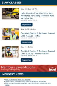 We also offer classes in CPR/First Aid training, fall protection, blueprint reading, Construction Contracts and Lien Law, business and marketing classes and many more. In 2022, the BIAW provided education to over 800 members, held over 100 classes and helped countless more members with improving their businesses. Course schedules may be updated and added over time. Visit www.biaw.com to view the current offered classes.