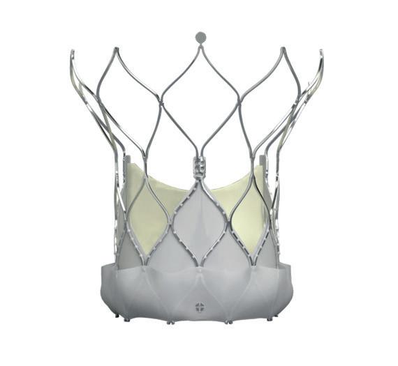 The self-expanding device features a fabric cuff that is designed to reduce or eliminate paravalvular leak (PVL), as well as intra-annular leaflets and large frame cells to facilitate future access to the coronary arteries.