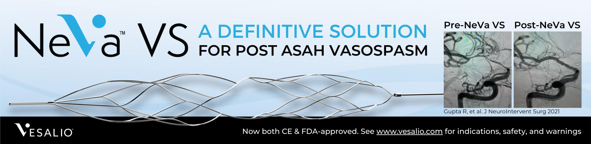 Neva VS has been designed to address a “critical unmet need” in the management of cerebral vasospasm following aSAH, according to a Vesalio press release. Already US Food and Drug Administration (FDA)approved under a humanitarian device exemption, it is said to offer a safer alternative to balloon angioplasty, with the added advantage of preserving distal blood flow while treating critically narrowed vessels.