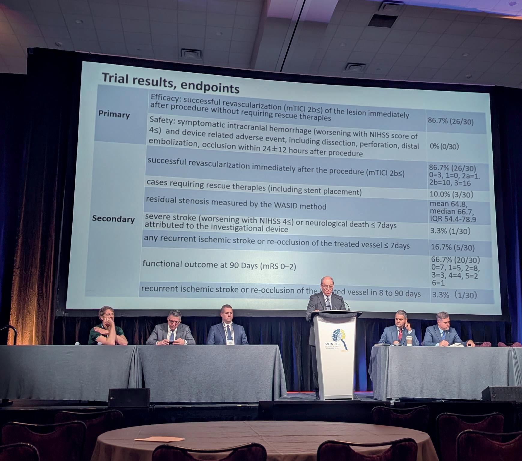 arm, as mortality (11.1% vs 10.2%, respectively) and symptomatic ICH (4.7% vs 2.2%, respectively) occurred at statistically comparable rates across the study arms. Delivering the final verdict based on these data, Jing described the magnitude of benefit with thrombectomy in the trial as “substantial”—positing that, for every 100 MeVO stroke patients who underwent the procedure, 54 experienced a less disabling outcome and a further 12 achieved functional independence compared to those who received medical management only, resulting in a number needed to treat (NNT) of just eight. He concluded that thrombectomy therefore appears to be appropriate in “carefully selected” ischaemic stroke patients with smaller, more distal occlusions, but added that future studies incorporating refined imaging-based case selection and standardised procedural approaches will be critical to optimising outcomes for this emerging patient population.