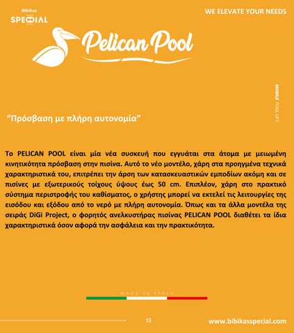 Το PELICAN POOL είναι μία νέα συσκευή που εγγυάται στα άτομα με μειωμένη κινητικότητα πρόσβαση στην πισίνα. Αυτό το νέο μοντέλο, χάρη στα προηγμένα τεχνικά χαρακτηριστικά του, επιτρέπει την άρση των κατασκευαστικών εμποδίων ακόμη και σε πισίνες με εξωτερικούς τοίχους ύψους έως 50 cm. Επιπλέον, χάρη στο πρακτικό σύστημα περιστροφής του καθίσματος, ο χρήστης μπορεί να εκτελεί τις λειτουργίες της εισόδου και εξόδου από το νερό με πλήρη αυτονομία. Όπως και τα άλλα μοντέλα της σειράς DiGi Project, ο φορητός ανελκυστήρας πισίνας PELICAN POOL διαθέτει τα ίδια χαρακτηριστικά όσον αφορά την ασφάλεια και την πρακτικότητα.