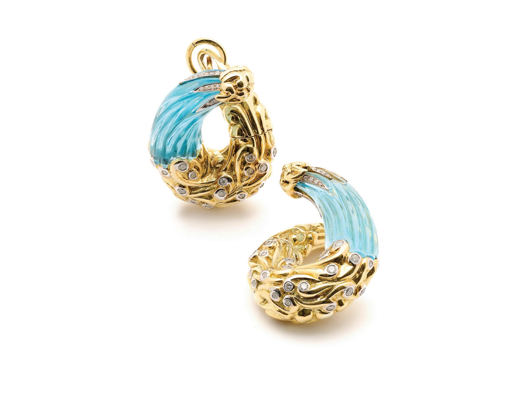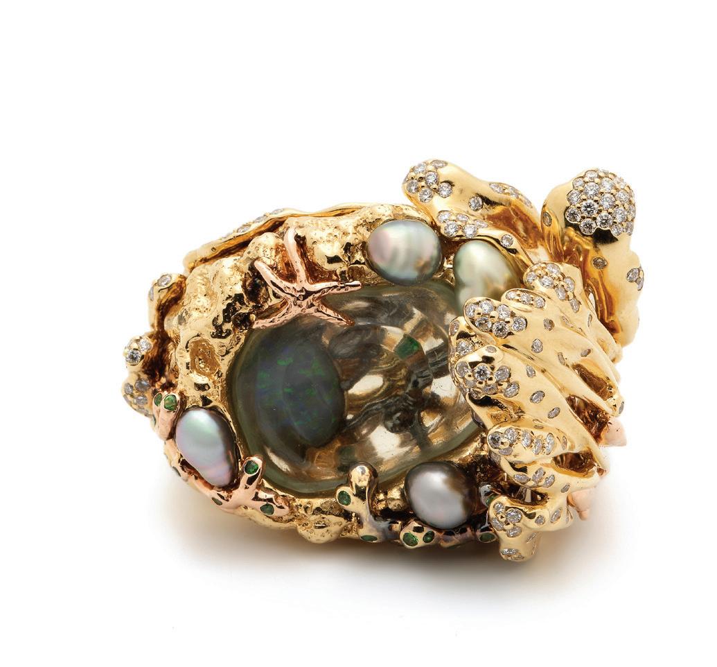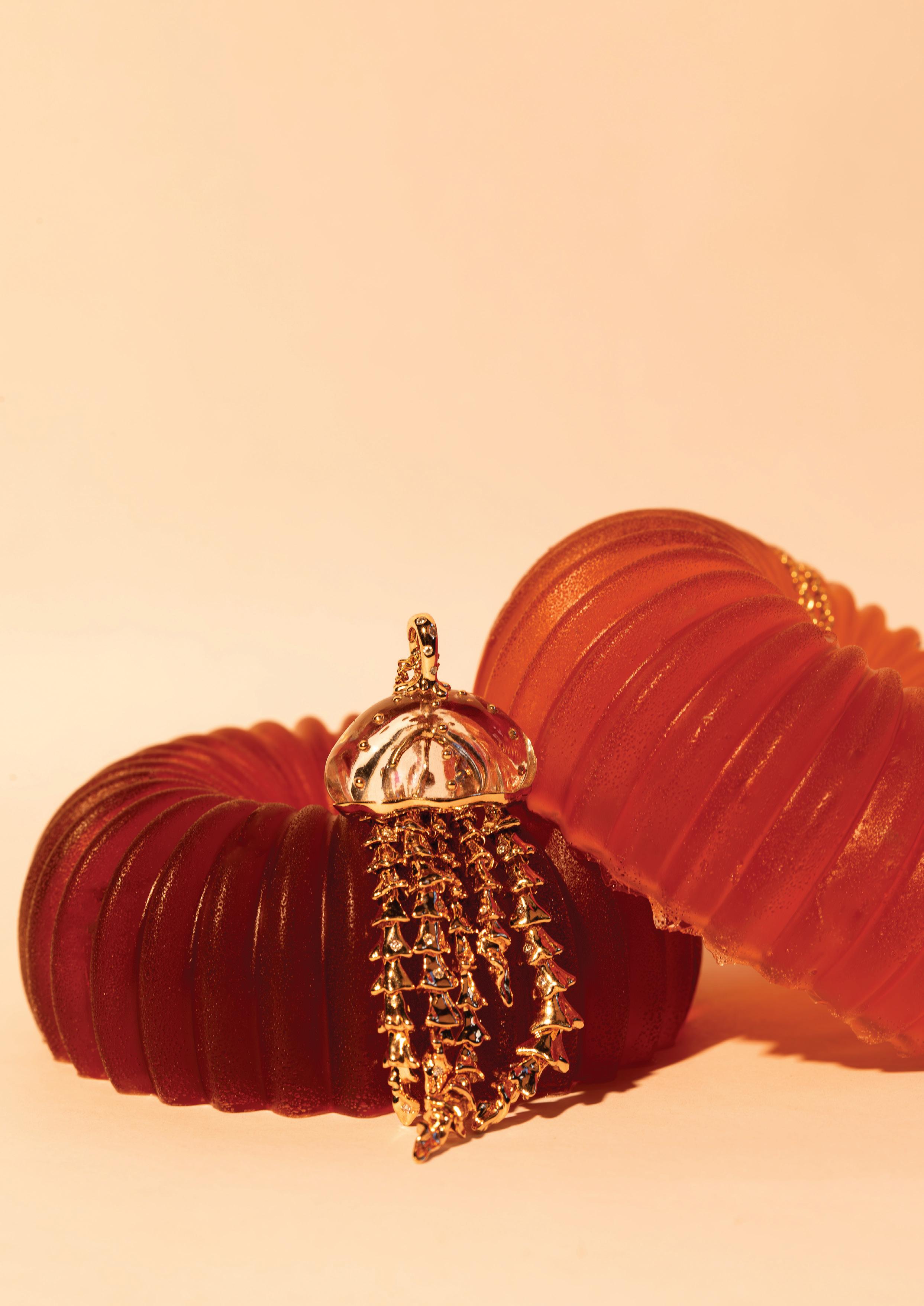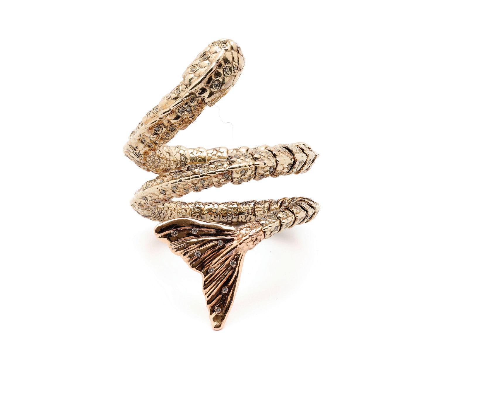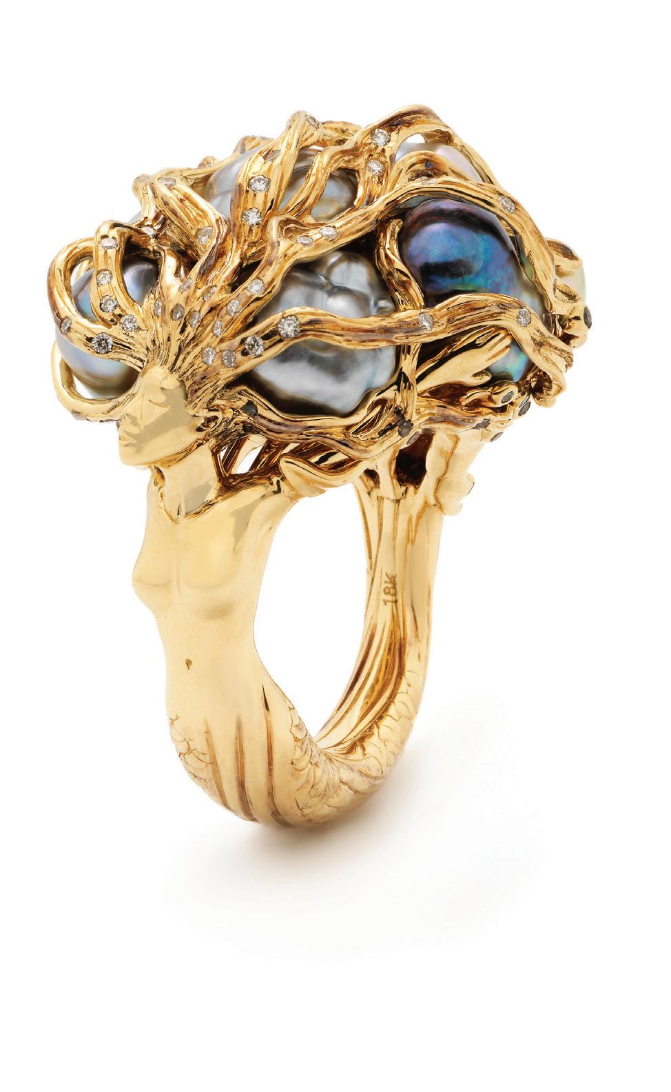 Bold, striking rings are shaped like sea goddesses or mysterious mermaids swimming in precious stones. Earrings take on sculptural shapes that evoke the surging force of a breaking wave or imagine a glimpse of a mermaid’s tail as a single stud. And the sinuous, organic form of sea kelp becomes a bracelet in gleaming gold.