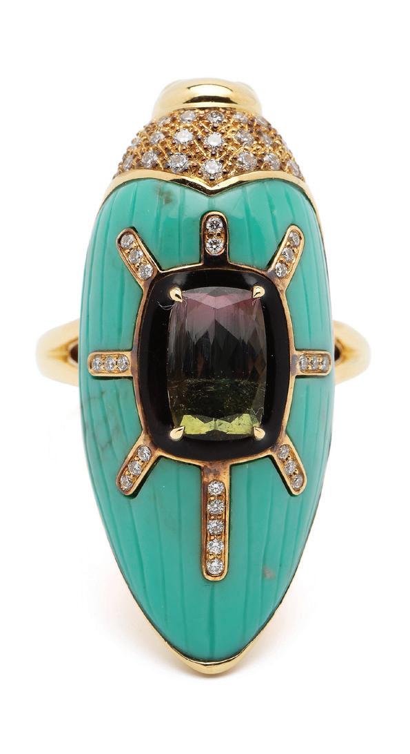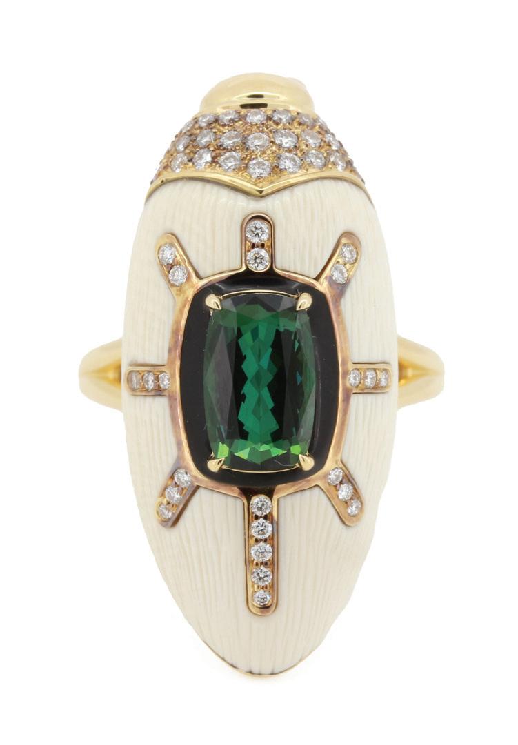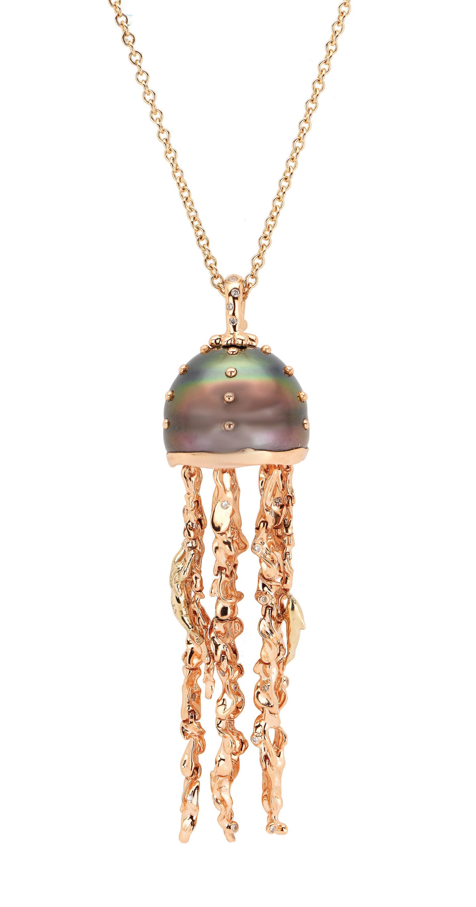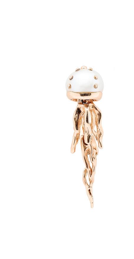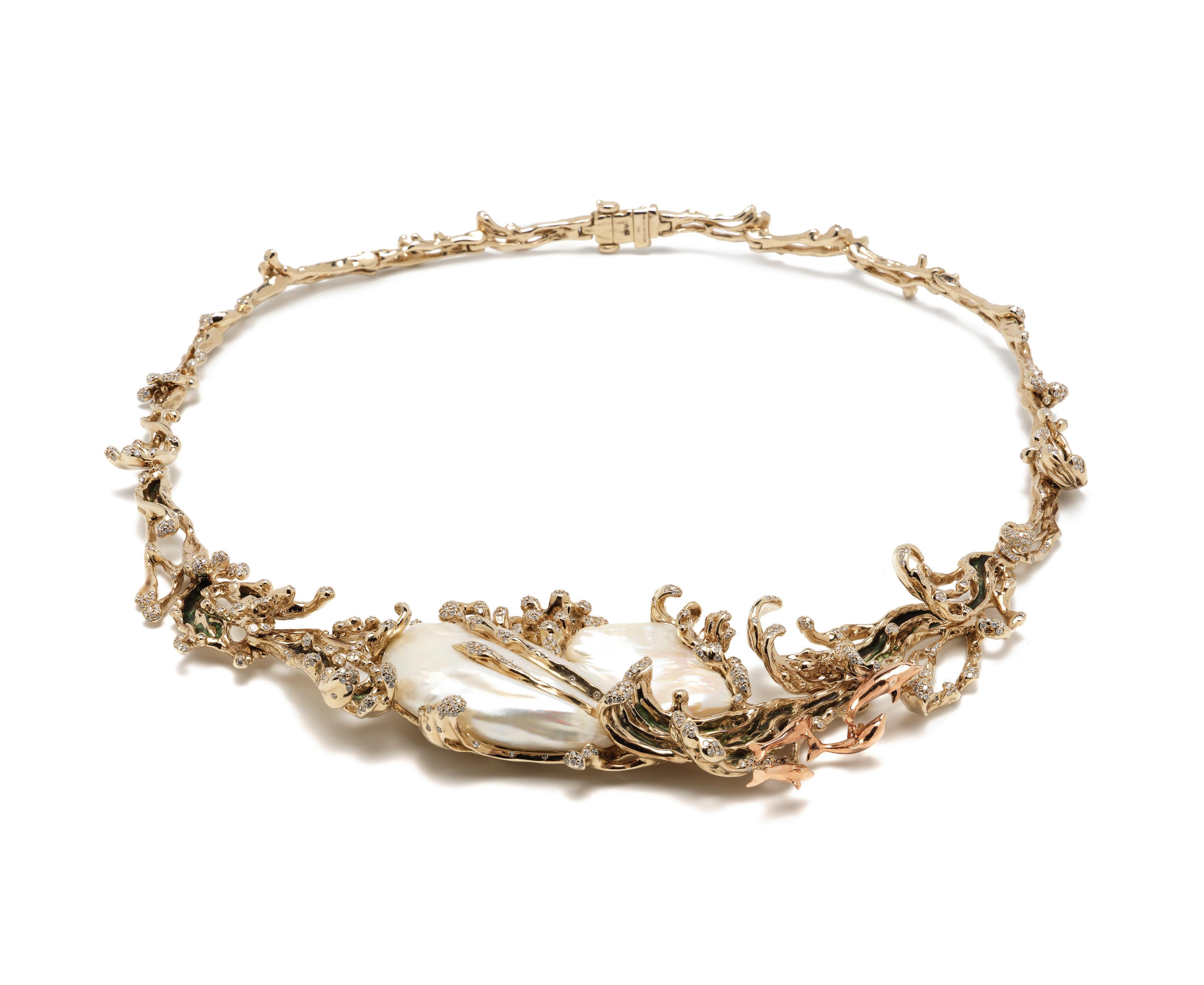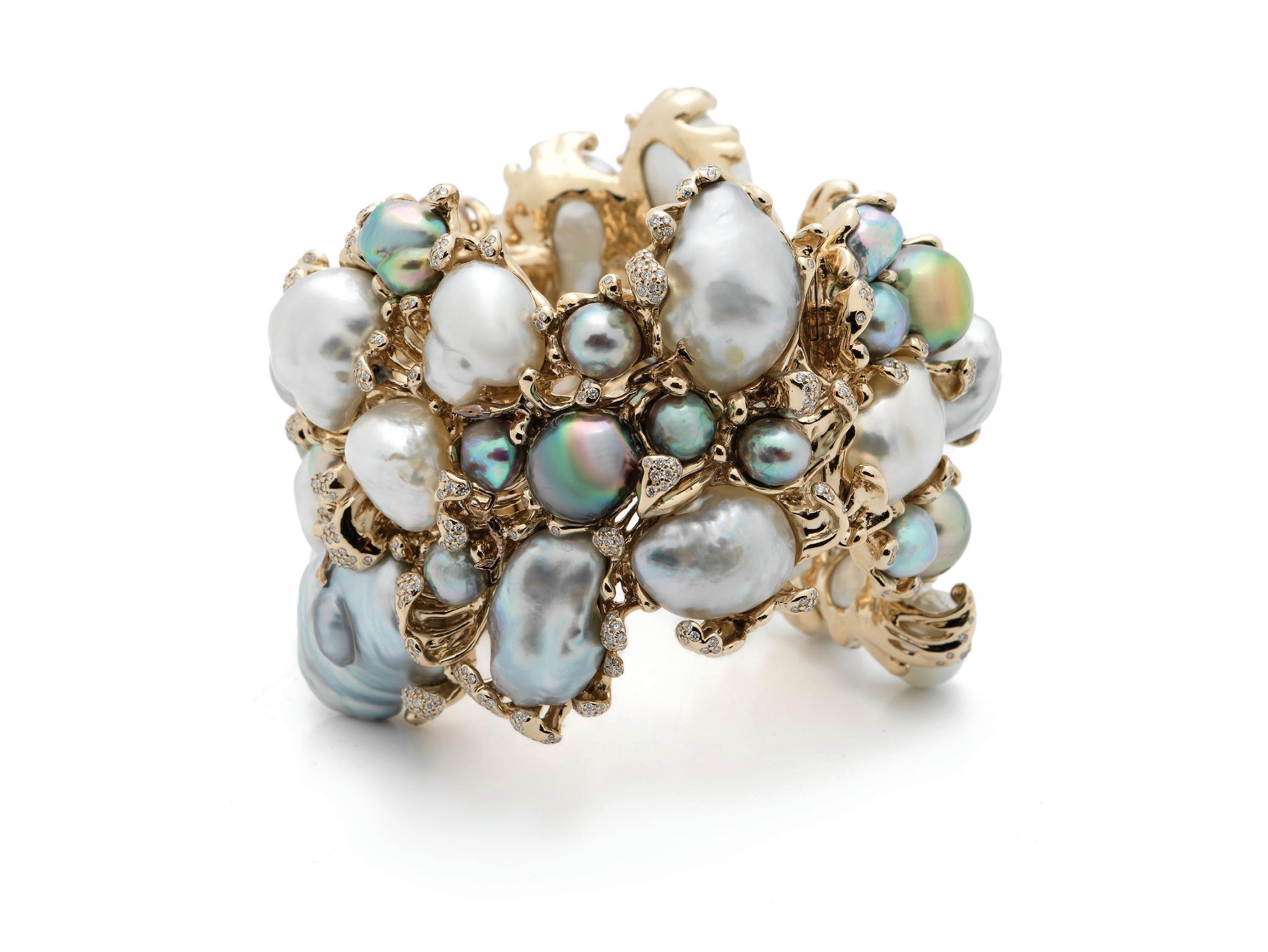 Bold, striking rings are shaped like sea goddesses or mysterious mermaids swimming in precious stones. Earrings take on sculptural shapes that evoke the surging force of a breaking wave or imagine a glimpse of a mermaid’s tail as a single stud. And the sinuous, organic form of sea kelp becomes a bracelet in gleaming gold.