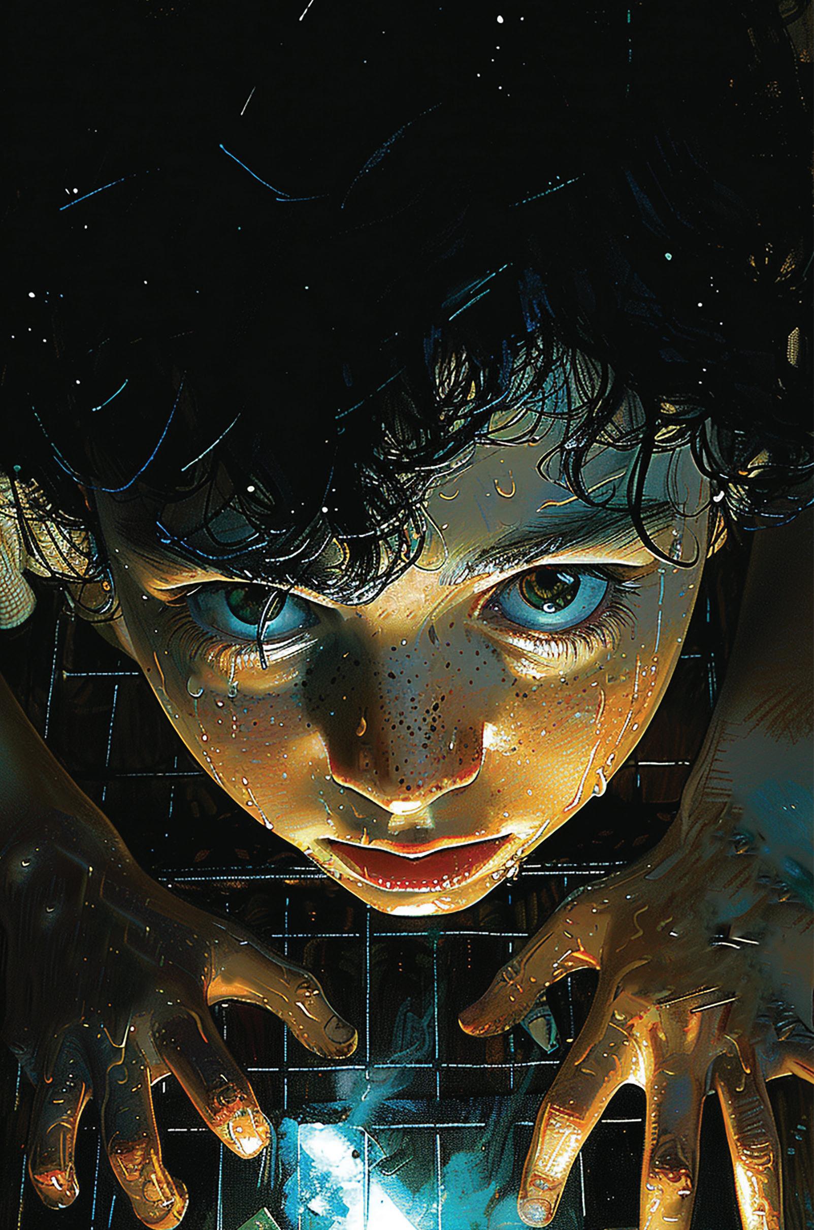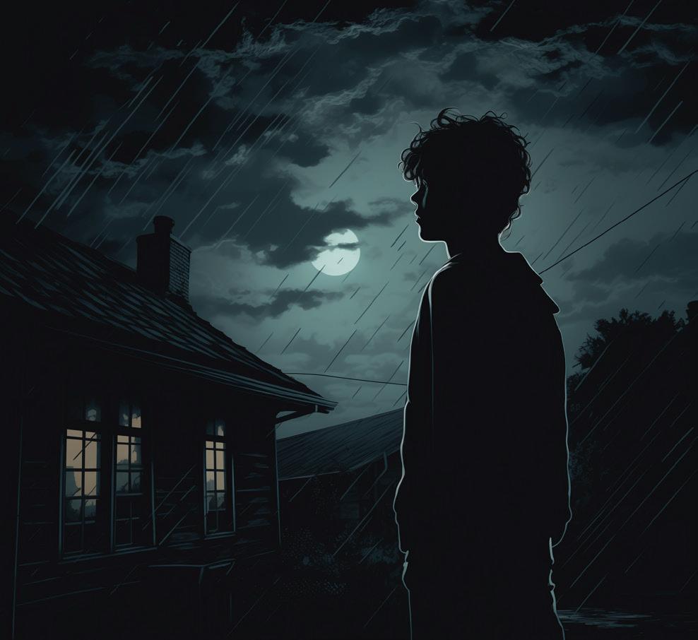 À l’étage supérieur, l’enfant sursaute de peur en entendant la porte claquer. Il se lève d’un bond, délaissant les fissures du plancher pour se rendre à la fenêtre d’angle. Pour survivre, il disparaît parmi les ombres.