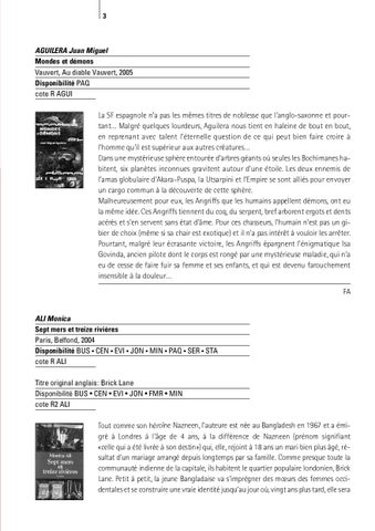 ALI Monica Sept mers et treize rivières Paris, Belfond, 2004 Disponibilité BUS • CEN • EVI • JON • MIN • PAQ • SER • STA cote R ALI Titre original anglais: Brick Lane Disponibilité BUS • CEN • EVI • JON • FMR • MIN cote R2 ALI