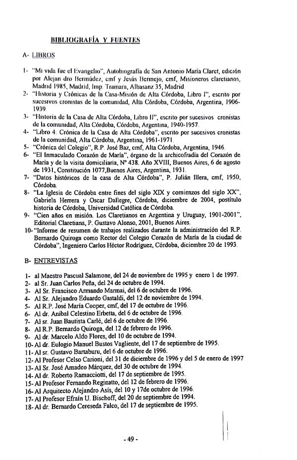 J. "Historia de la Casa de Alta Córdoba, Libro I", cscrito por sucesivos cronistas de la comunidad, Alla Córdoba, Cordoba, Argentina, 1940-1957. bro4: Crónica de la Casa dc Alta Córdoba", cscrilo por sucesivos cronistas de la comunidad, Alta Córdoba, Argentina, 1961-1971 Cronica del Colegio,RP José Baz, cmf, Alta Córdoba, Argentina, 1946 E Inmaculado Corazón de Maria", órgano de la archicolradia del Corazon de Maria y de la visita domiciliaria, N° 438. Año XVI1, Buenos Aires, 6 de agosto de 1931, Constitución 1077,Buenos Aires, Argentina, 1931.