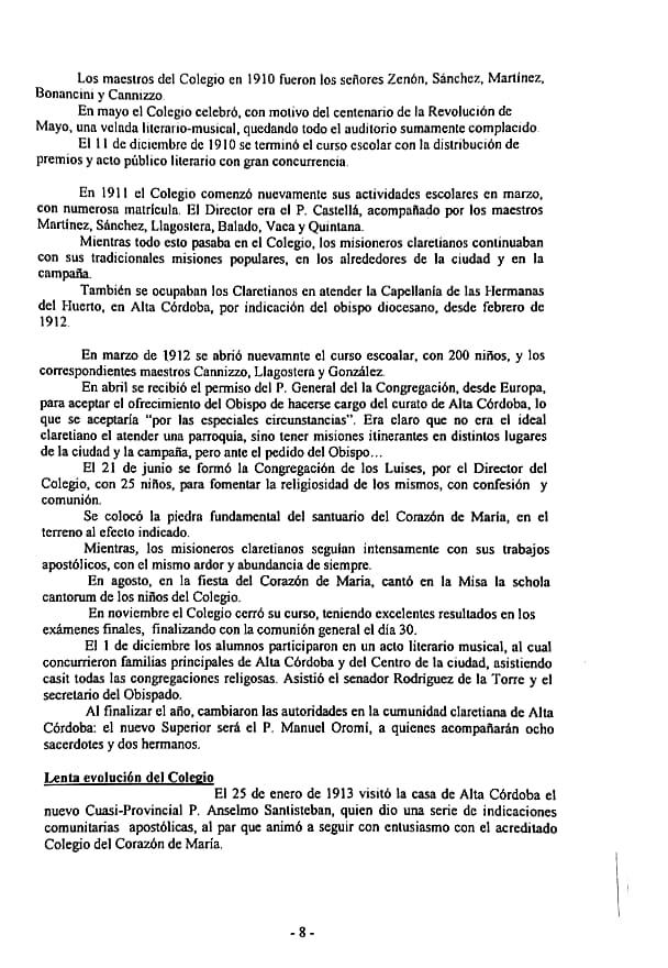 En marzo de 1912 se abrió nuevamnte el curso escoalar, con 200 niños, y 105 correspondentes maesu pGeneral del la Congregación, desde Europa, para aceptar el ofrecimiento del Obispo de hacerse cargo del curato de Alta Córdoba, lo que se aceptaría por las especiales circunstancias. Era claro quc no cra cl ideal clareliano el atender una parroquia, sino tener misiones itinerantes en distinlos lugares de la ciudad y la campaña, pero ante el pedido del Obispo.