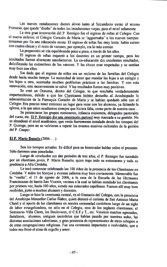En realidad, estuvo aqui 13 periodos de 3 años cada uno. Era una pregunta que Se nacia todo ei mundo. Incluso en el seminarno de villa Ciaret se conversaba este punto. Si quieren, podemos avenurar una expiucacionCómo mover de un puesto a alguien que desarollaba tamaña labor gigantesca como acabamos de enumerar? EvIdentemente, la obra constructora del P. Quiro8a era impresionante, estremecedora, inconmensurable. Como hemos dicho al comienzo, uno era el Colegio antes del P. Quiroga y otro fue después.Yno sólo la construcciòn. Ya hemos hablado también del prestigio creciente que uie adquiriendo el CorazZ0n de Marna luego de los austes academicos que introdujo el P QUrga NUEsto olegio se convirio _en uno de los teterenles ae la eaucaciOn en ordoda. El mismo P. Quiroga, especializado en educación, se convirio en asesor de Ministernio de Educación, como vimos al comienzo, para reglamentar la ley pertinente El P. Quroga se convirtió en el reterente maximo de la educacion privada en Cordoba. Cuando en algún Instituto Privado había alguna duda o conflicto, era comun que el P. Quiroga fuera consultado para dar luz al dificil problema Aparecieron también otros elementos: nuestros alumnos egresados del Secundario tenian grandes perscctivas en la Universidad, particularmente en carreras como Ingenieria o Ciencias Económicas. Era "vox populi" que en el Primer Año de esas carreras nuestros egresados estaban más aliviados que el resto de los ingresantes a la Universidiad.