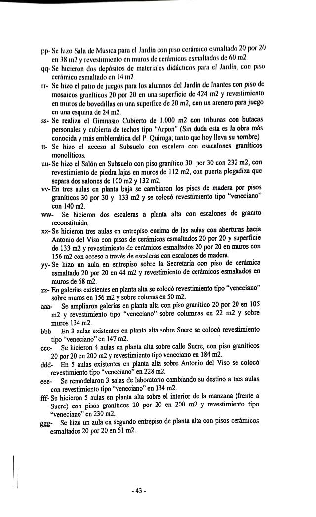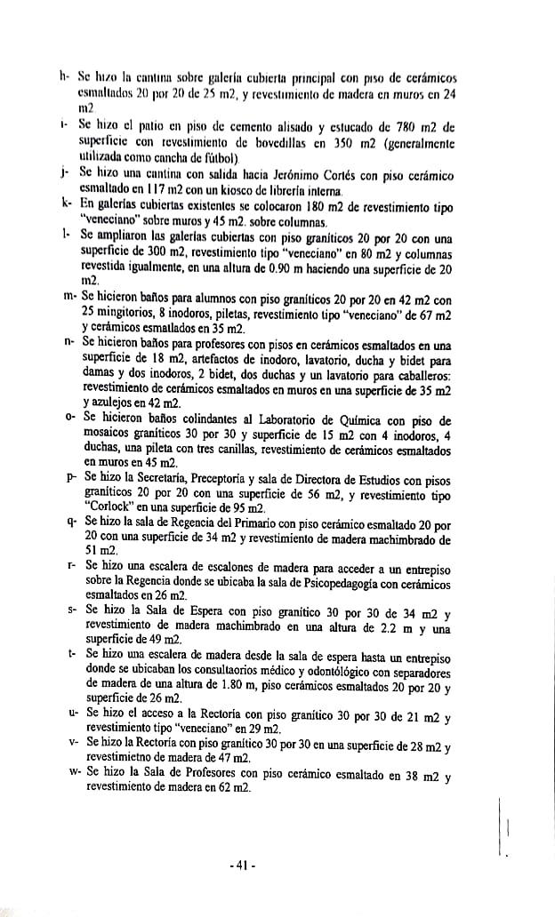 f#f-Se hicieron 5 aulas en planta alta sobre el intenor de la manzana (frentea Sucre) con pisos graniucos 20 por 20 en 200 m2 y revestimiento tipo venecian0 en 250 mz.