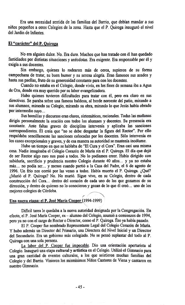 ET P. Cooper decidió mirar la rica bistoria del Colegio y rescatarla. Con la ayudade algunos docentes instaló el Museo del Colegio, con totos, recuerdos, mapas,aparatos, etc, todos elementos que daban testimonio de nuestro glonoso Pasado. Ademas, y en el mismo sentido de revalorizar nuestro pasado, el P. Cooper convoco a las primeras camadas de bachilleres (1944) y que en 1994 Cumplian sus Bodas ae oro: egaron los primeros egresados de nucstro Colegio y dieron generosamente sus Tecuerdos, los cuales fueron recopilados por un profesor de historia del Colegio que, encargado por el P. Cooper, comenzó a pergeñar la historia del mismo. on la consulta a las Crónicas del Colegio, más los recuerdos de los egresados de las distintas camadas que siguieron viniendo a celebrar sus bodas dc oro, nas muchos recuerdos de muchas personas, se armó la histora del Colegio. Todo obra del P. Cooper, que tuvo tan buena actuación en nuestras vidas.