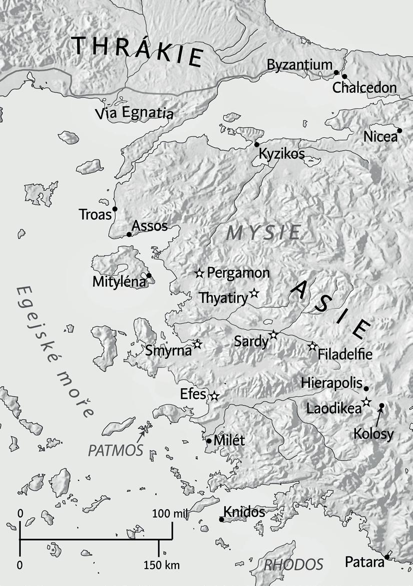 t Geografický kontext knihy Zjevení. Kniha Zjevení vznikla v době pronásledování křesťanů v římské provincii Asie (2. polovina 1. stol.). Autor spisu, podle rané křesťanské tradice apoštol Jan, sepsal ve vyhnanství na ostrově Patmos poselství sedmi církvím v Malé Asii, kde dříve působil (na mapce označeny hvězdičkami).