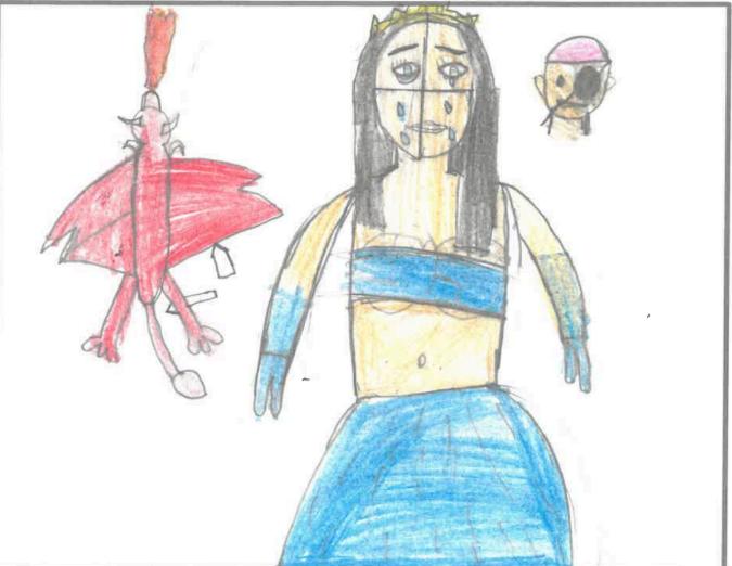 Un dia quan la princesa estava jugant, el germà, li va venir corrent perquè havia vist un drac.Va dir que si tenia por que el matès, però ell tenia molta por. La princesa li deia: però mata’l!!! La princesa va agafar una espasa i va guanyar al drac, va salvar la vida als pares i al germà