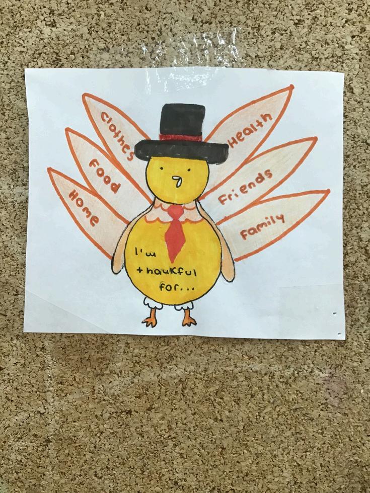 En el cuerpo del pavo han escrito (I’m thankful for...) y en cada pluma una razón por las que dan las gracias (food, my family, my best friends, etc.).