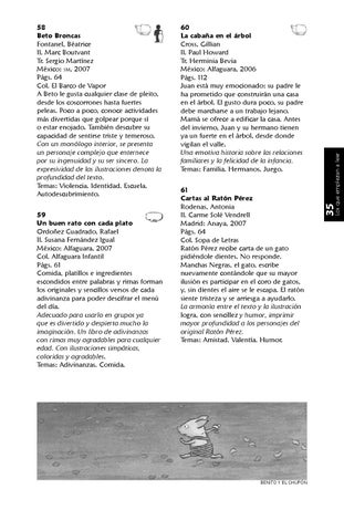 58 Beto Broncas Fontanel, Béatrice Il. Marc Boutvant Tr. Sergio Martínez México: SM, 2007 Págs. 64 Col. El Barco de Vapor A Beto le gusta cualquier clase de pleito, desde los coscorrones hasta fuertes peleas. Poco a poco, conoce actividades más divertidas que golpear porque sí o estar enojado. También descubre su capacidad de sentirse triste y temeroso. Con un monólogo interior, se presenta un personaje complejo que enternece por su ingenuidad y su ser sincero. La expresividad de las ilustraciones denota la profundidad del texto. Temas: Violencia. Identidad. Escuela. Autodescubrimiento.