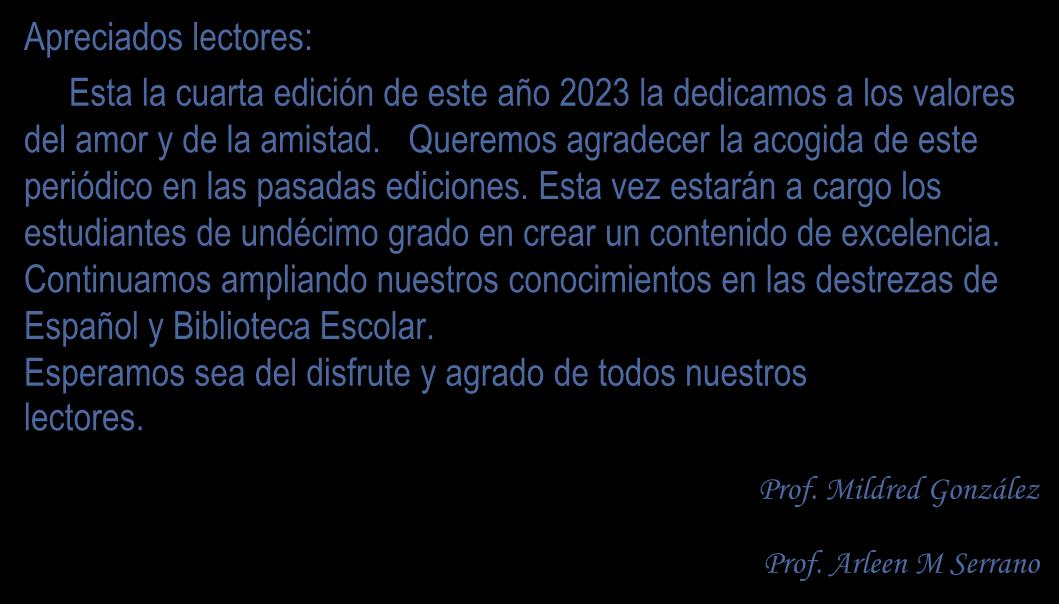 Esta la cuarta edición de este año 2023 la dedicamos a los valores del amor y de la amistad. Queremos agradecer la acogida de este periódico en las pasadas ediciones. Esta vez estarán a cargo los estudiantes de undécimo grado en crear un contenido de excelencia. Continuamos ampliando nuestros conocimientos en las destrezas de Español y Biblioteca Escolar. Esperamos sea del disfrute y agrado de todos nuestros lectores.